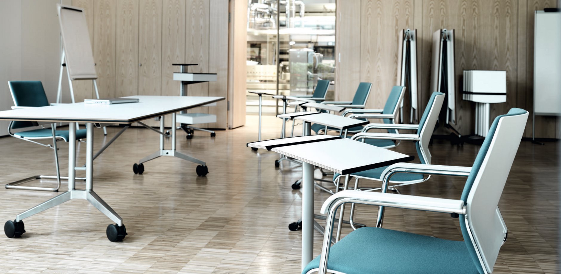 这张桌子在节约空间方面有着出色的设计。分工合作、灵活的团队合作以及自由职业者与项目团队的短期整合已经成为我们日常工作的一个组成部分。也就是说,这是在工作环境必须体现出来的时候了。这就是为什么我们设计了一张能容纳个人或者八人组的会议表。它可以简单地与其他个人桌子连接起来,形成一个会议桌,并且可以在不需要的时候立即折叠起来,放置在房间的一侧。因此,每个人都可以像环境所允许的那样富有创造力。