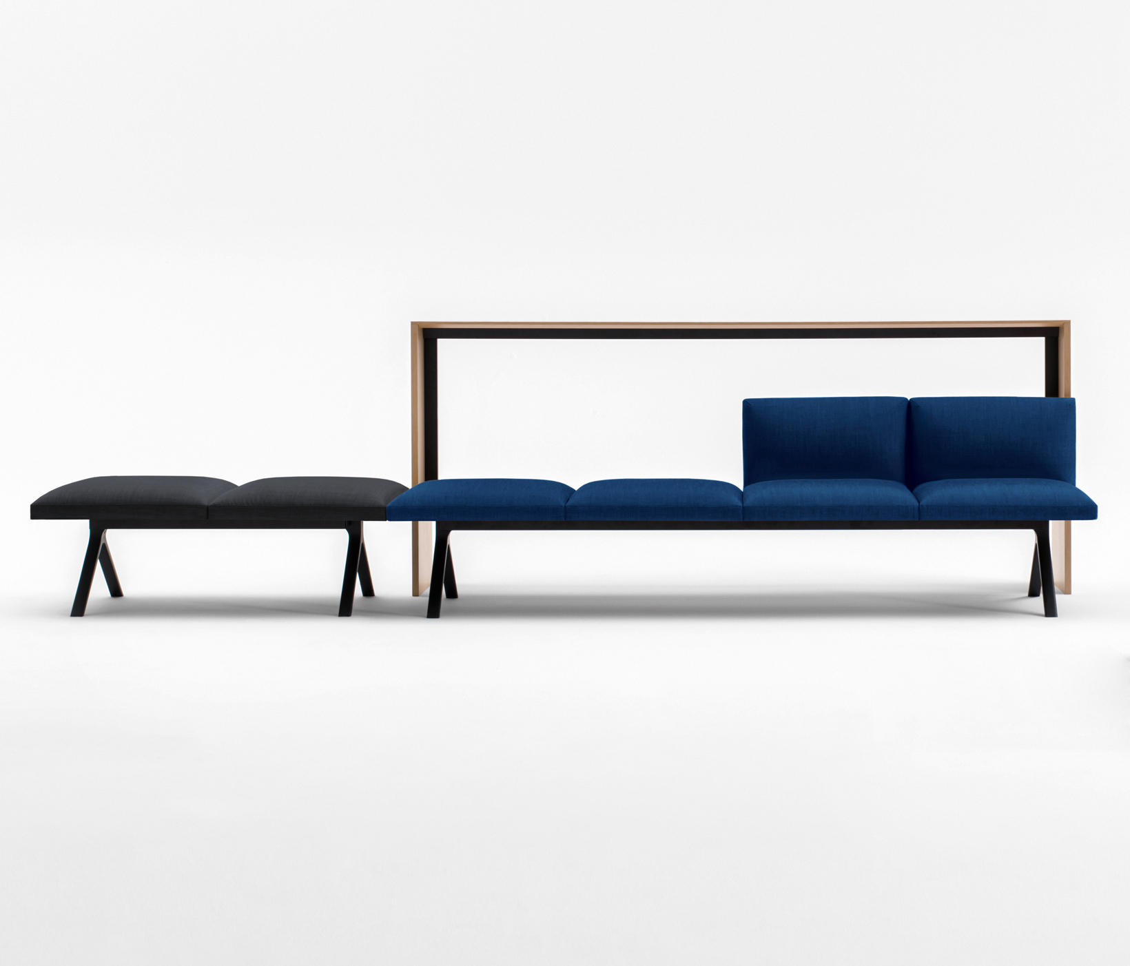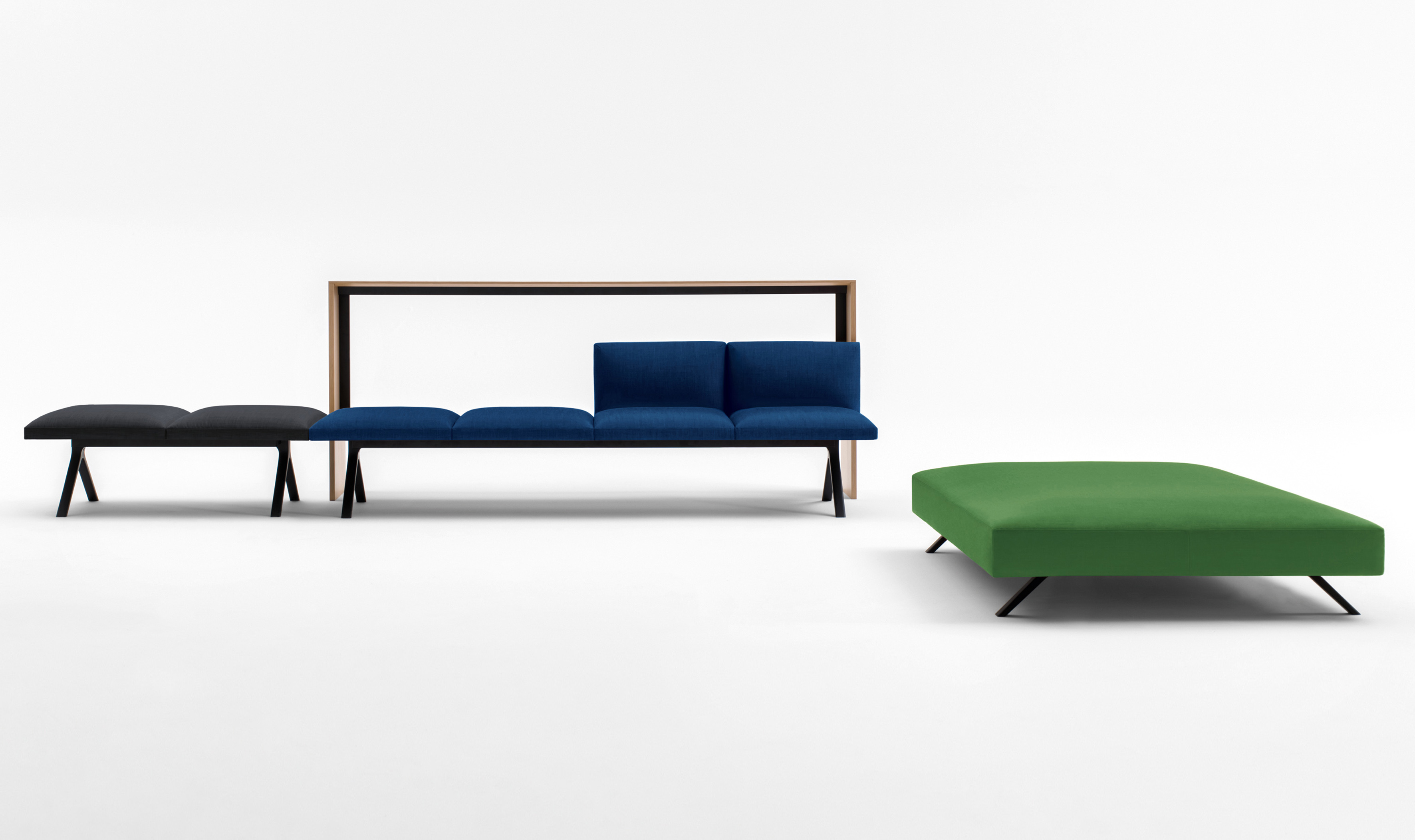 Kiik是一个模块化系统,由各种尺寸的框架组成,可与垫子结合,可提供或不提供63x63 cm靠背,座位高度为45 cm。Kiik桌子有不同的形状和尺寸(矩形、方形、三角形、四分之一圆形),因此允许线性和L形模块(120°和90°)。该系列的补充是一个控制台与252x40厘米的三个高度顶部:58,72 e 105厘米,和126x157.5厘米的座椅高度36厘米的搁脚凳。