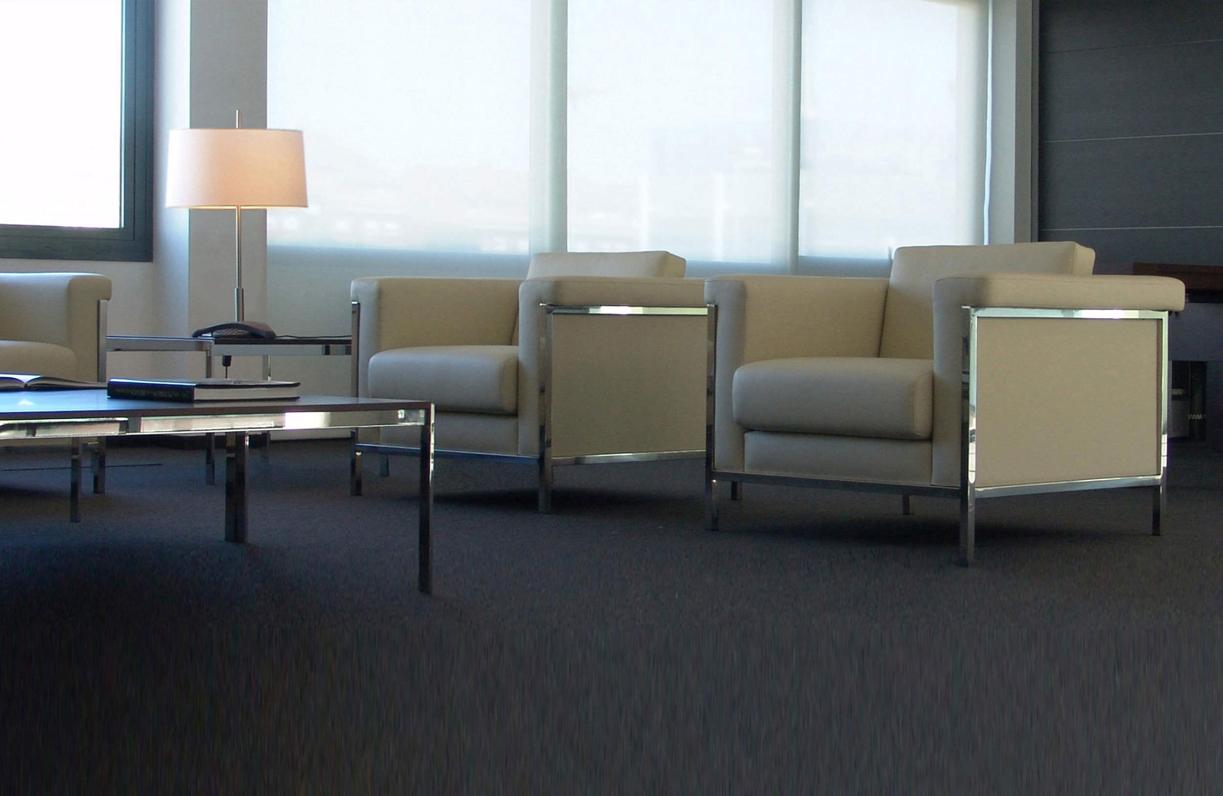 安装在黑色漆金属无框架上。一体式框架,无接头。低靠背与扶手齐平。可拆卸座椅和靠背垫。