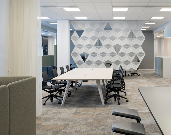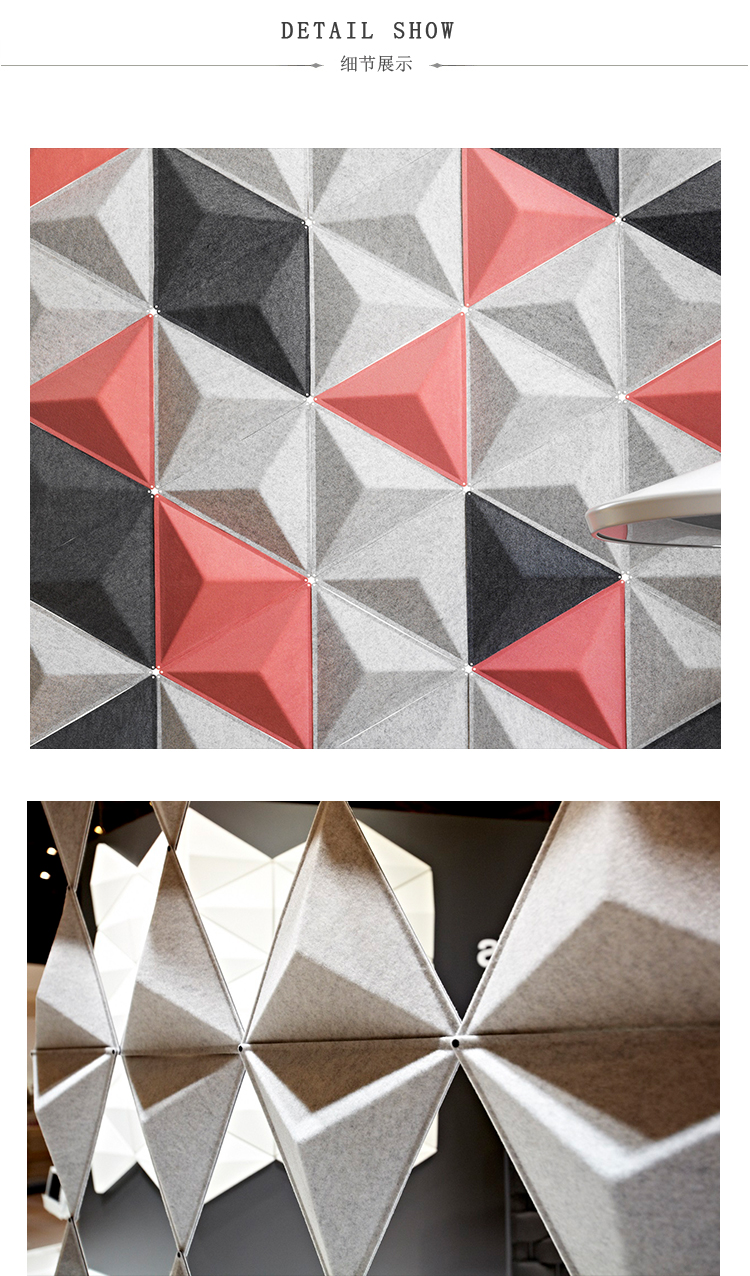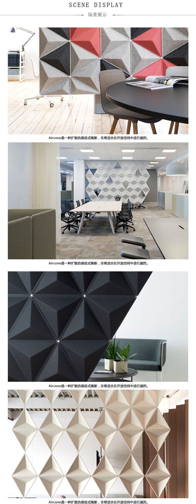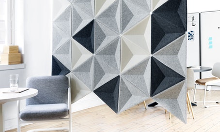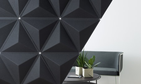 将Aircone与吸音产品相结合,确保出色的音响效果。Aircone包括由模制纤维毡制成的三角形模块。模块可以与剪辑连接以创建不同类型的图案形成。使用白色或银色阳极氧化铝导轨连接到天花板或墙壁。