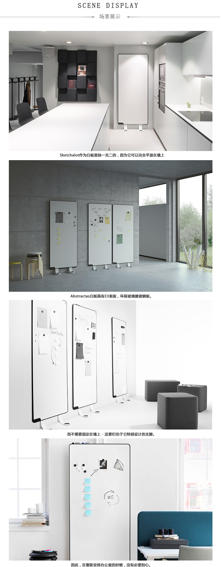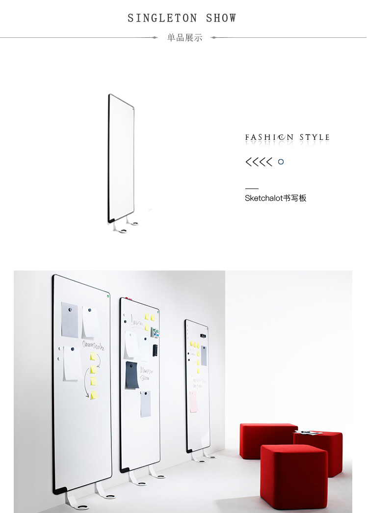Sketchalot是一种独特的书写板,无需任何墙壁安装。该设计允许板垂直于墙壁倾斜。因此,Sketchalot非常适用于有玻璃或混凝土墙的环境,或者您不希望在墙上打洞的任何房间。电路板相互堆叠,便于存放。书写板由刨花板主体上的E3磁性搪瓷钢板组成。白色珐琅金属板背面。框架由模制的圆形凸起黑色塑料边缘组成。白色铝脚可以不用工具安装。这些板非常适合将多个板紧密地安装在一起。