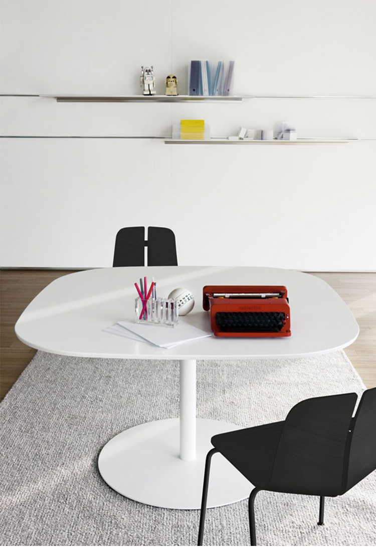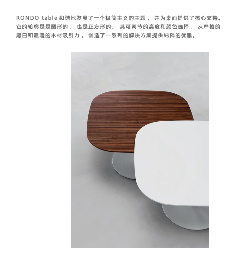 RONDO table和谐地发展了一个极简主义的主题,并为桌面提供了核心支持。它的轮廓是是圆形的,也是正方形的。其可调节的高度和颜色选择,从严格的黑白和温暖的木材吸引力,创造了一系列的解决方案提供纯粹的优雅。