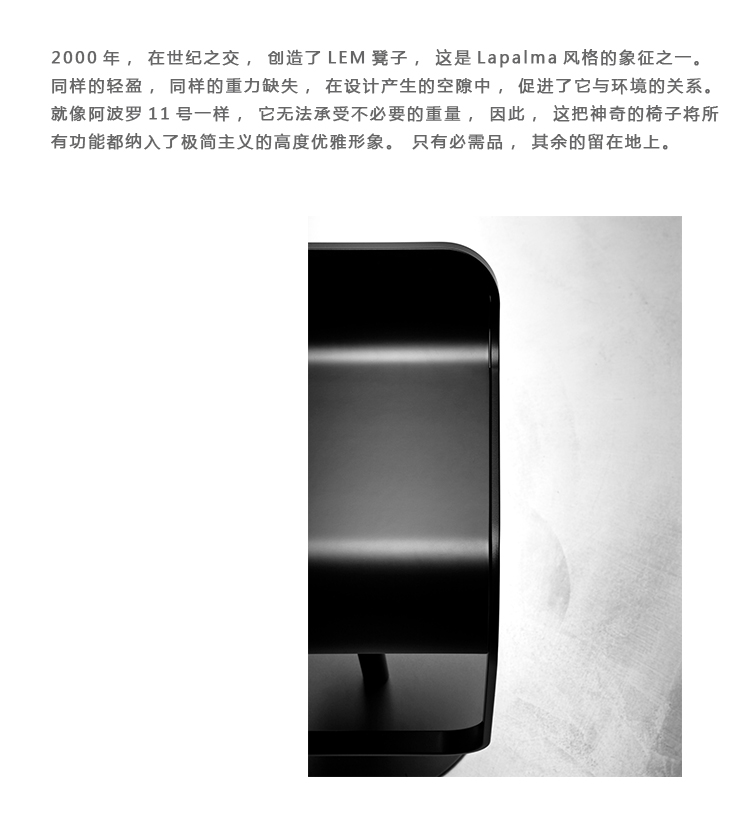 2000年,在世纪之交,创造了LEM凳子,这是Lapalma风格的象征之一。同样的轻盈,同样的重力缺失,在设计产生的空隙中,促进了它与环境的关系。就像阿波罗11号一样,它无法承受不必要的重量,因此,这把神奇的椅子将所有功能都纳入了极简主义的高度优雅形象。只有必需品,其余的留在地上。