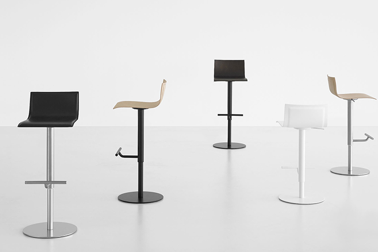 用旋转座椅和可调整高度的大便与喷砂不锈钢和钢中的圆形底座与«亚麻织物»图案或完全粉末涂覆。座椅在几个饰面与厚度变化胶合板,更薄的边缘。有多种饰面或在皮革软垫。