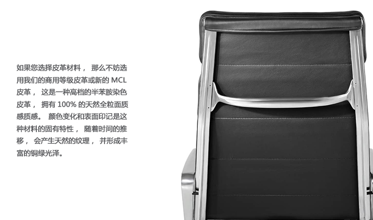 Charles与RayEames夫妇是20世纪最有影响力的安博anbo(中国),卓越的设计涵盖了安博网页版、建筑、影像与平面设计。他们从二次世界大战中美国海军的实验计画中学习经验并发展可谓是现今工业中使用模铸胶合版的先锋,这对设计界的超级夫妇档自1940年参与了由MOMA举办的有机安博网页版设计大赛,自今已有近百件他们的作品被各大博物馆所永久典藏。Eames® Soft Pad Executive Chair(伊姆斯软包大班椅)是夫妻俩1958年设计的,是在全铝系列的基础上发展的另一系列Eames产品。舒适系列在全铝的椅架上增加了皮革制的柔软坐垫和靠背,高级铝合金制作,压模五星脚,可旋转。背垫和坐垫,采用西皮,具有透气性强,内部填充高密度定型绵,不易变形,不老化,依人体坐姿,符合人体工学,耐水及对人体无害等优势。椅子扶手选用优质电镀铝合金扶手,手感舒适,永久不生锈。转椅底盘为多功能底盘,可以保护使用者长时间坐用腿部健康,且作为高度可多定位调节。气压棒采用的气杆是正规厂家出产的外贸气杆,每一根气杆都有钢印,经过严格SGS检测的才可出厂,旋转、升降自如基本无声响,使用寿命长,可承受250kg,可升降数万次,将椅面调至与膝盖同高时,使用者坐下后双脚跟可垂直平放于地上,且大腿与地面平行,最符合人体工学理论,使用者长期久坐,也不想疲惫。办公椅脚为铝合金材质永久不生锈、承受能力强,安全更放心。椅子脚轮采用优质电镀片脚轮,耐用而美观,可以随意变换位置,贴心更方便,具有防震及防松脱,让椅子的安全性能更加可靠。