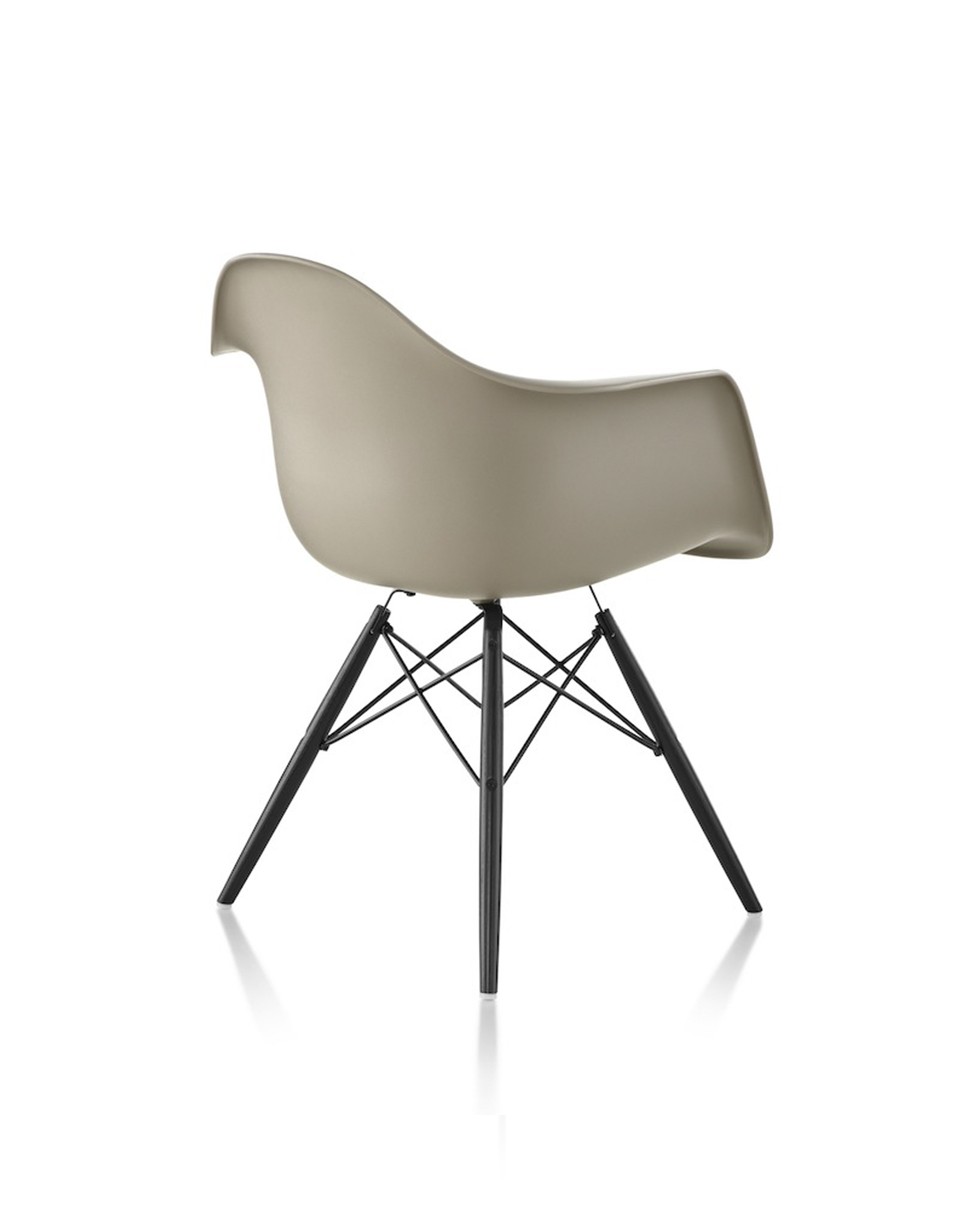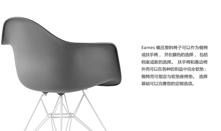 本单品为Eames Plastic Chair 系列成员之一,舒适的椅座外观设计是以添加了玻璃纤维强化的塑料来制作,再搭配上各式不同的脚座来增添使用的多样化,值得一提的是Eames Plastic Chair 的创新技术与材质,便它得以成为全世界第一张被大量制造的单椅。拜现今创新的科技所赐,全系列的Eames Plastic chair 终于再次制造,使用环保可回收的聚丙烯材质,求制作线条优美的椅座外壳,不但重量更轻,同时更具有更好的耐热性及抗化学性。