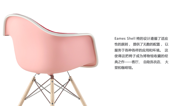 本单品为Eames Plastic Chair 系列成员之一,舒适的椅座外观设计是以添加了玻璃纤维强化的塑料来制作,再搭配上各式不同的脚座来增添使用的多样化,值得一提的是Eames Plastic Chair 的创新技术与材质,便它得以成为全世界第一张被大量制造的单椅。拜现今创新的科技所赐,全系列的Eames Plastic chair 终于再次制造,使用环保可回收的聚丙烯材质,求制作线条优美的椅座外壳,不但重量更轻,同时更具有更好的耐热性及抗化学性。