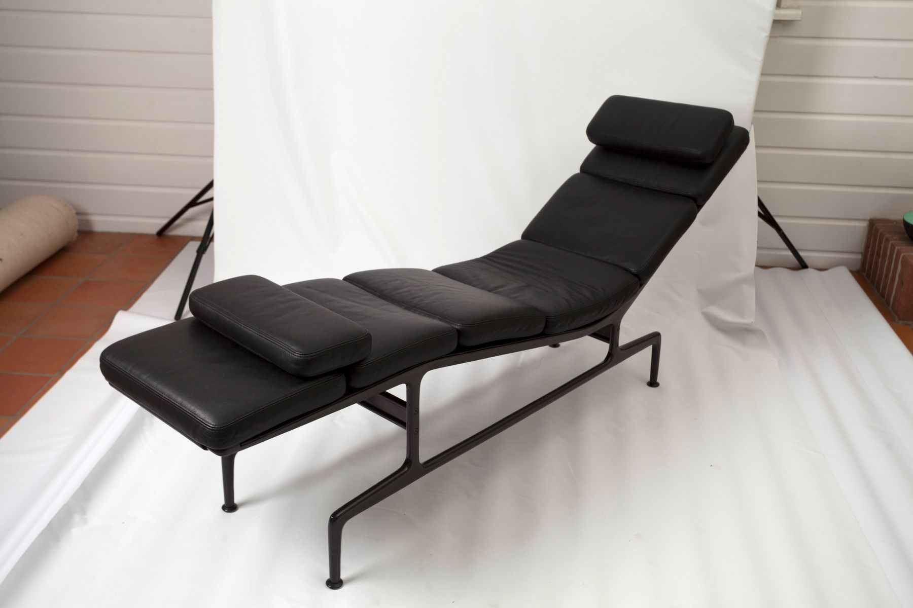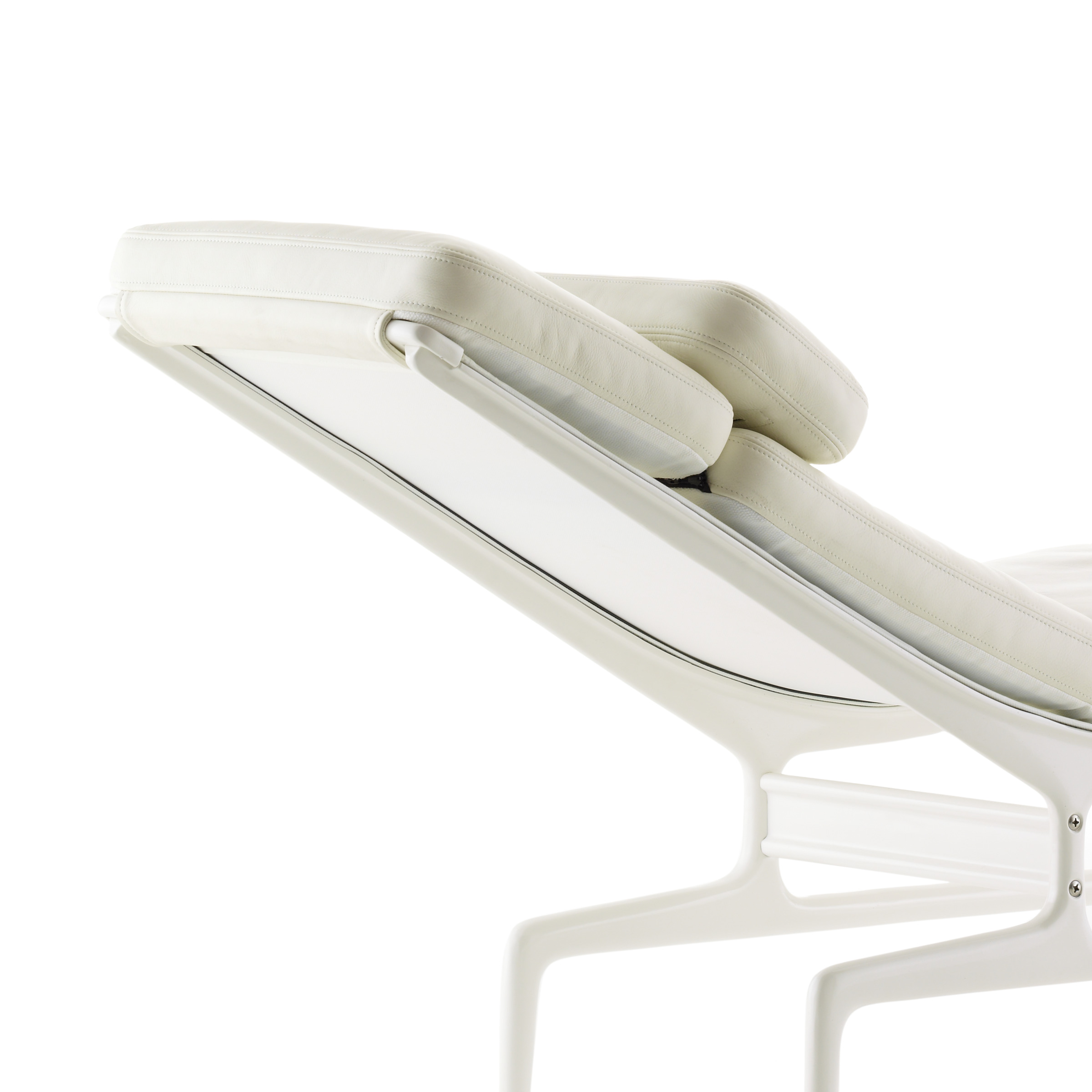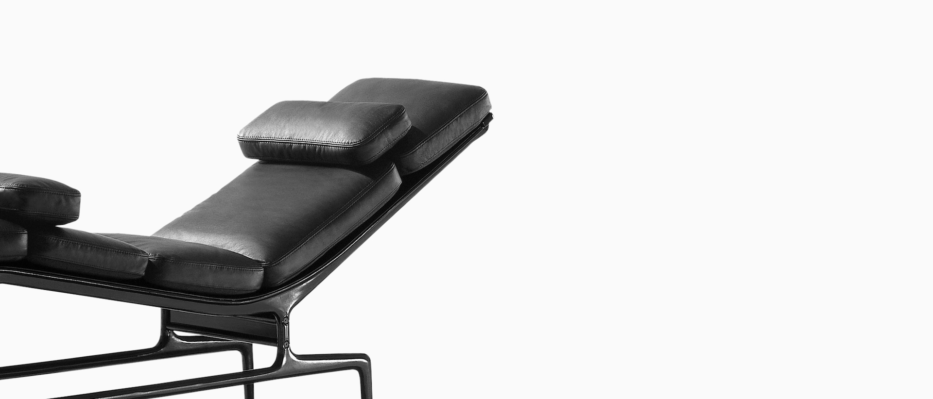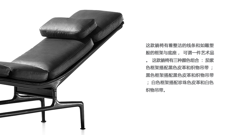 这款躺椅有着整洁的线条和如雕塑般的框架与底座,可谓一件艺术品。这款躺椅有三种颜色组合:茄紫色框架搭配黑色皮革和织物吊带;黑色框架搭配黑色皮革和织物吊带;白色框架搭配珍珠色皮革和白色织物吊带。
