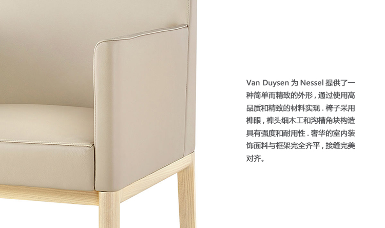 古典现代主义对范杜尔森的设计产生了重要的影响,法国建筑师让-米歇尔·弗兰克的作品也是如此,他在三十年代进行了实践,并以其整洁但奢华的安博网页版而闻名于世。在这些灵感来源的激励下,范杜森给了奈塞尔一个简单而复杂的形象,这是通过使用高质量和精良的材料来实现的。椅子是由榫和榫,细木工和凹槽角块构成的强度和耐久性。豪华的装潢面料与框架完全齐平,接缝也是完美的排列。