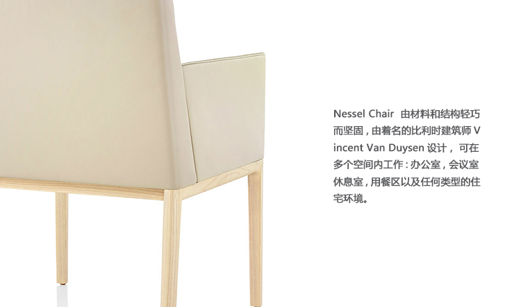 由比利时著名建筑师文森特·范·杜森(Vincent Van Duysen)设计的、材料和建筑轻巧但坚固的Nessel椅子,是为了在各种空间中工作而设计的:办公室、会议室、休息室、餐厅以及任何类型的住宅环境。设计时考虑到了保姆,它以一种克制和优雅的形式提供了最大的舒适感。该椅子的实木框架可以完成一系列低光泽或哑光木材完成。Nessel椅子,无论有没有手臂,都是在织物或皮革或两种对比织物中完全软垫的。