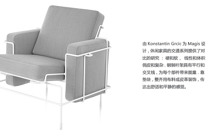 由Konstantin Grcic为Magis设计,休闲安博网页版的交通系列提供了对比的研究:硬和软,线性和体积,俏皮和复杂。 钢制杆架具有平行和交叉线,为每个部件带来能量。 靠垫块,整齐地用布料或皮革装饰,传达出舒适和平静的感觉。