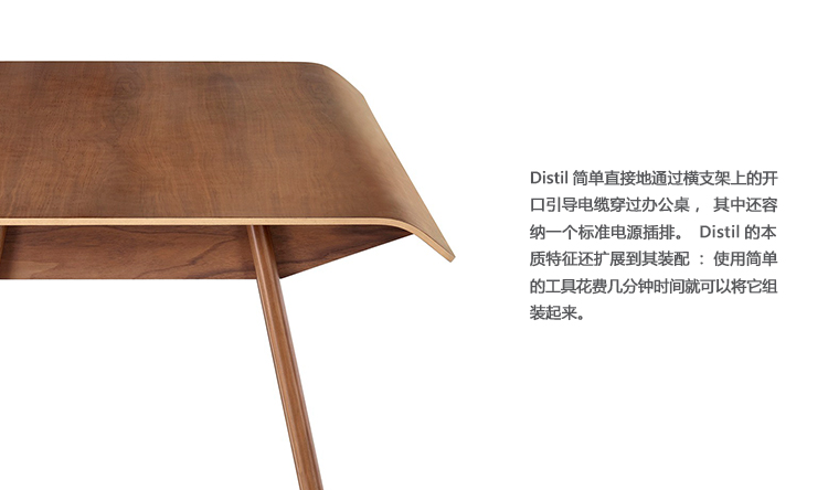 Distil简单直接地通过横支架上的开口引导电缆穿过办公桌,其中还容纳一个标准电源插排。Distil的本质特征还扩展到其装配:使用简单的工具花费几分钟时间就可以将它组装起来。