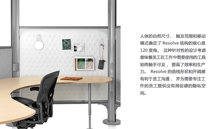 Resolve设计核心的开放式角度营造出引人动心的工作区域,促进同事间互动,为小空间带来宽敞的感觉。没有面板或墙壁的限制,空气和光线可以穿过空间,并为员工提供毫无阻挡的视野。屏风和天篷提供封闭和隐私感,平衡了设计中过于空旷的感觉。