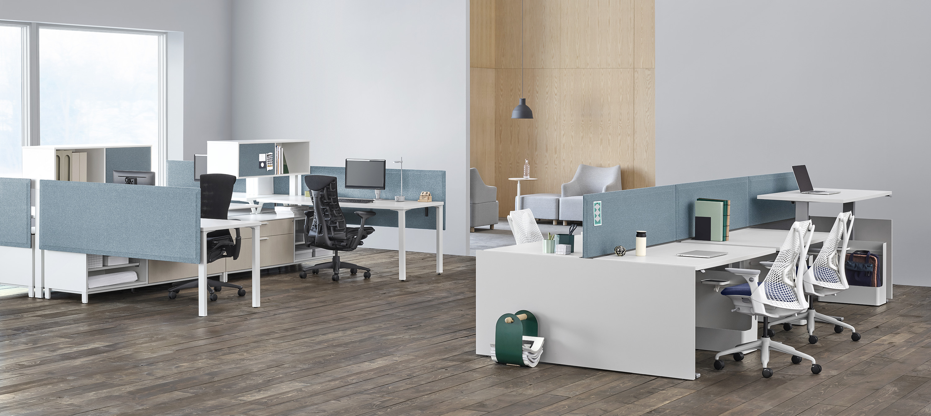 Pari是一个屏幕系列。 有些版本是独立式的,有些版本是贴在表面或框架上的,所有版本都是可粘的,并且共享无框架,薄的外形。 它们一致的细节和互补的颜色有助于美学的连续性,因为它们描绘了空间并提供了隐私。 Pari Screens与许多Herman Miller产品兼容,可在办公室环境中进行设置。 使用Pari Screens,组织可以压缩工作站并在较低的墙壁高度进行标准化,而不会牺牲员工所需的隐私,以便他们可以集中注意力,或创建个人空间的边界让他们感到舒适。