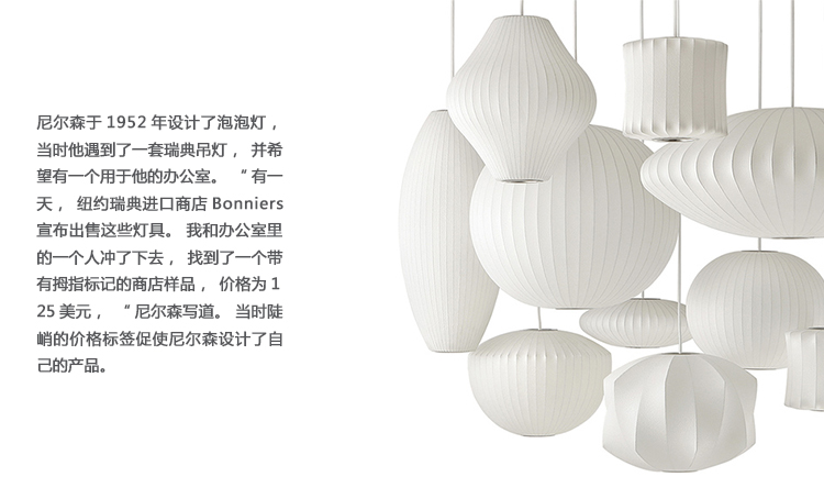 经典的乔治尼尔森设计,灯笼三脚架灯与传统灯笼的形状相呼应。 它安装在钢制三脚架上,可以保持在内部的不同位置,并包括一个7.5英尺的插入式电源线。 尼尔森于1952年设计了泡泡灯,当时他遇到了一套瑞典吊灯,并希望有一个用于他的办公室。 “有一天,纽约瑞典进口商店Bonniers宣布出售这些灯具。 我和办公室里的一个人冲了下去,找到了一个带有拇指标记的商店样品,价格为125美元,“尼尔森写道。 当时陡峭的价格标签促使尼尔森设计了自己的产品。