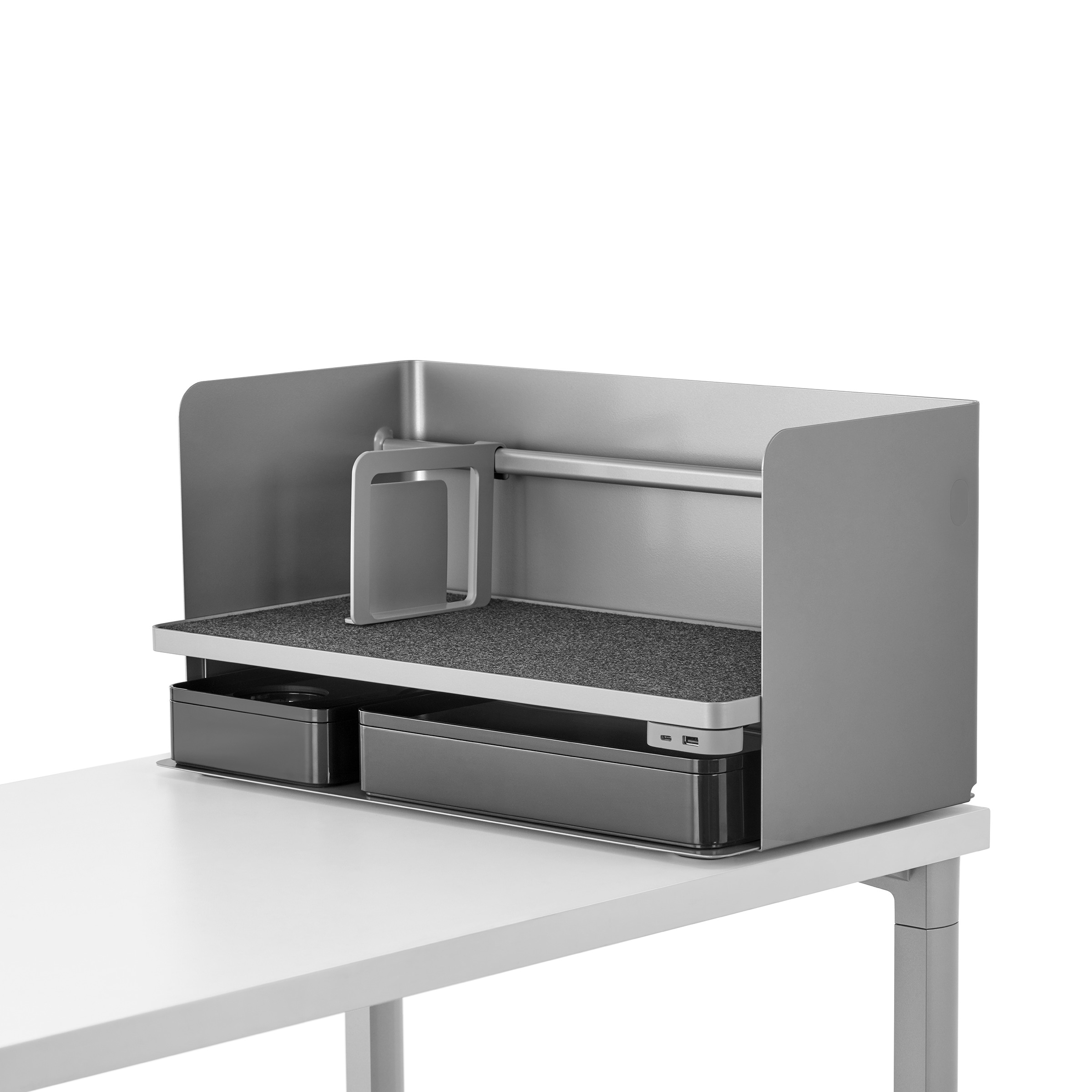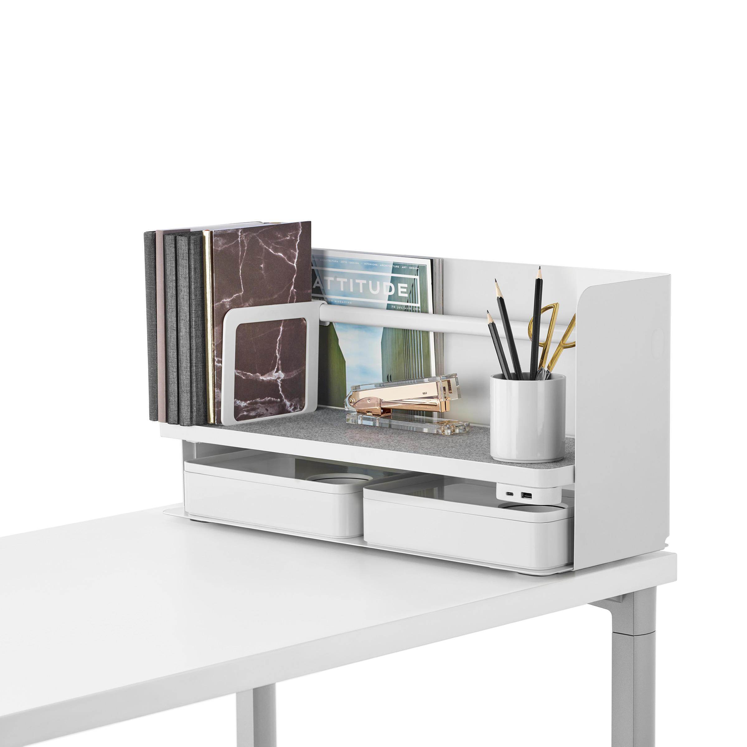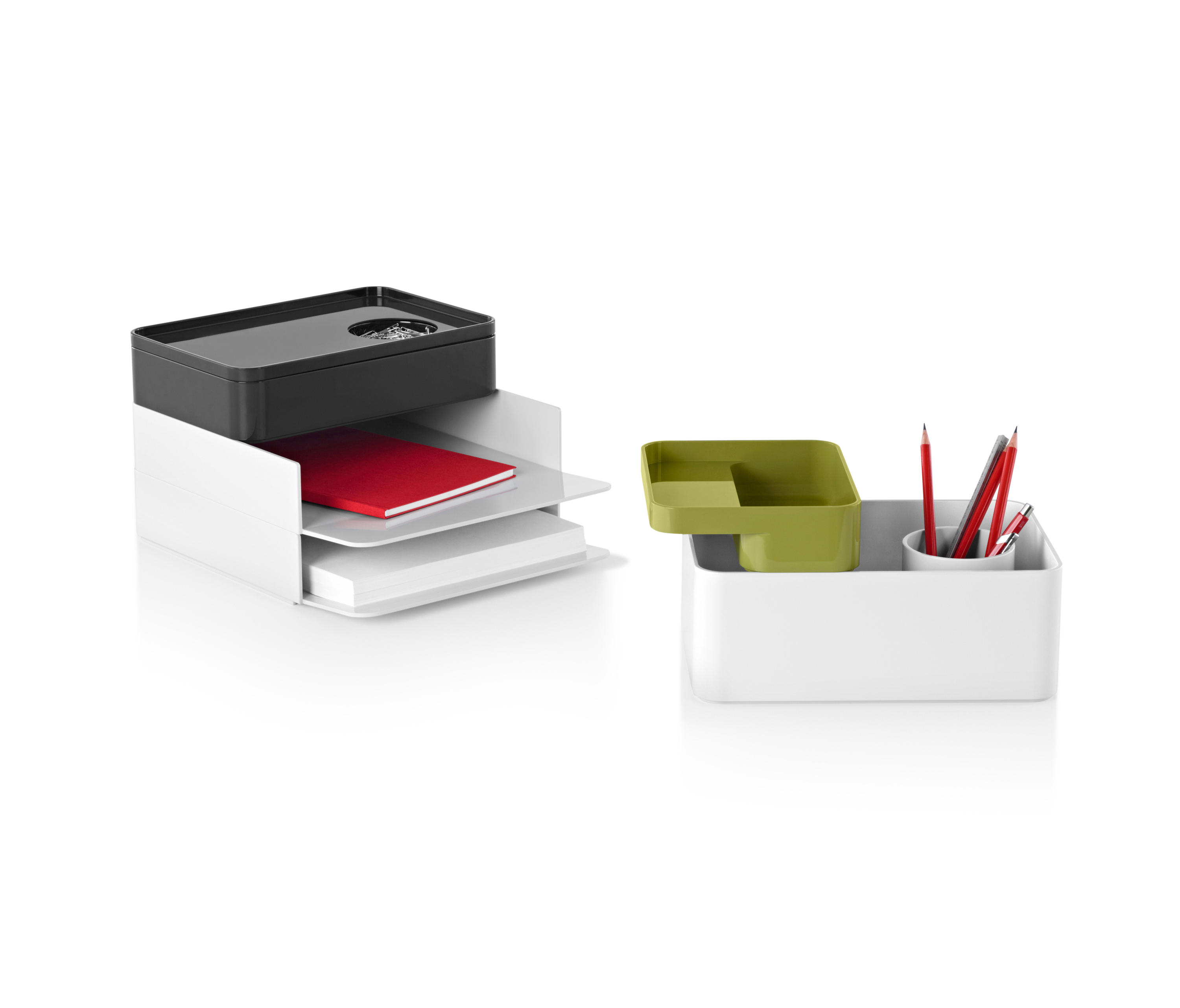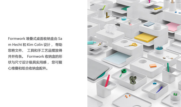 考虑到占据家庭及办公室空间的笨重物品的存放问题,Sam Hecht和Kim Colin设计了具有可拆卸盖子的储物盒。每个盖子上设计有孔洞,可供放置移动式笔筒。或者,笔筒可固定于储物盒内部孔洞下方压槽中,从而在无需打开盖子的情况下便可接触杯中物品。
