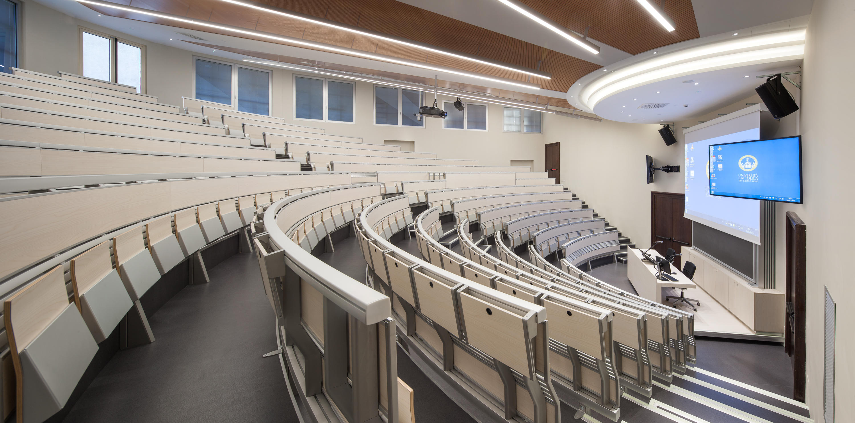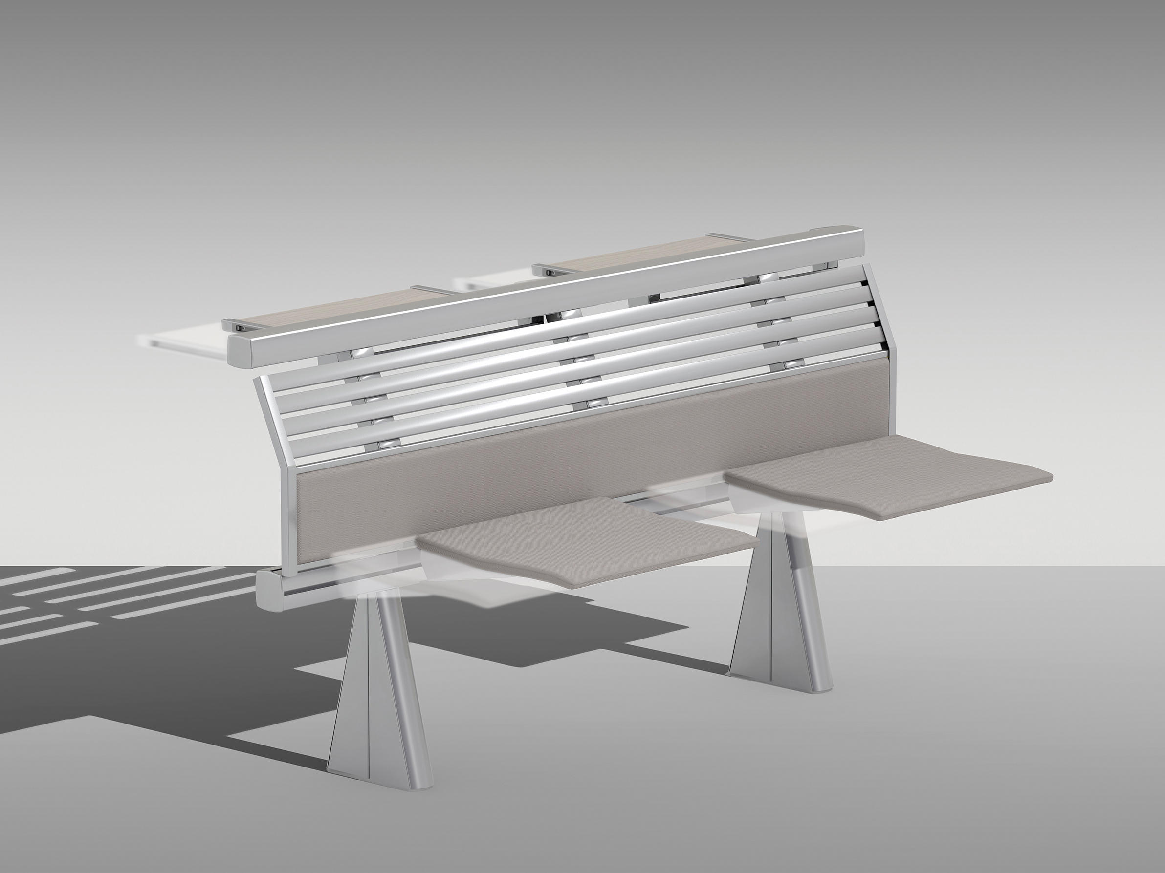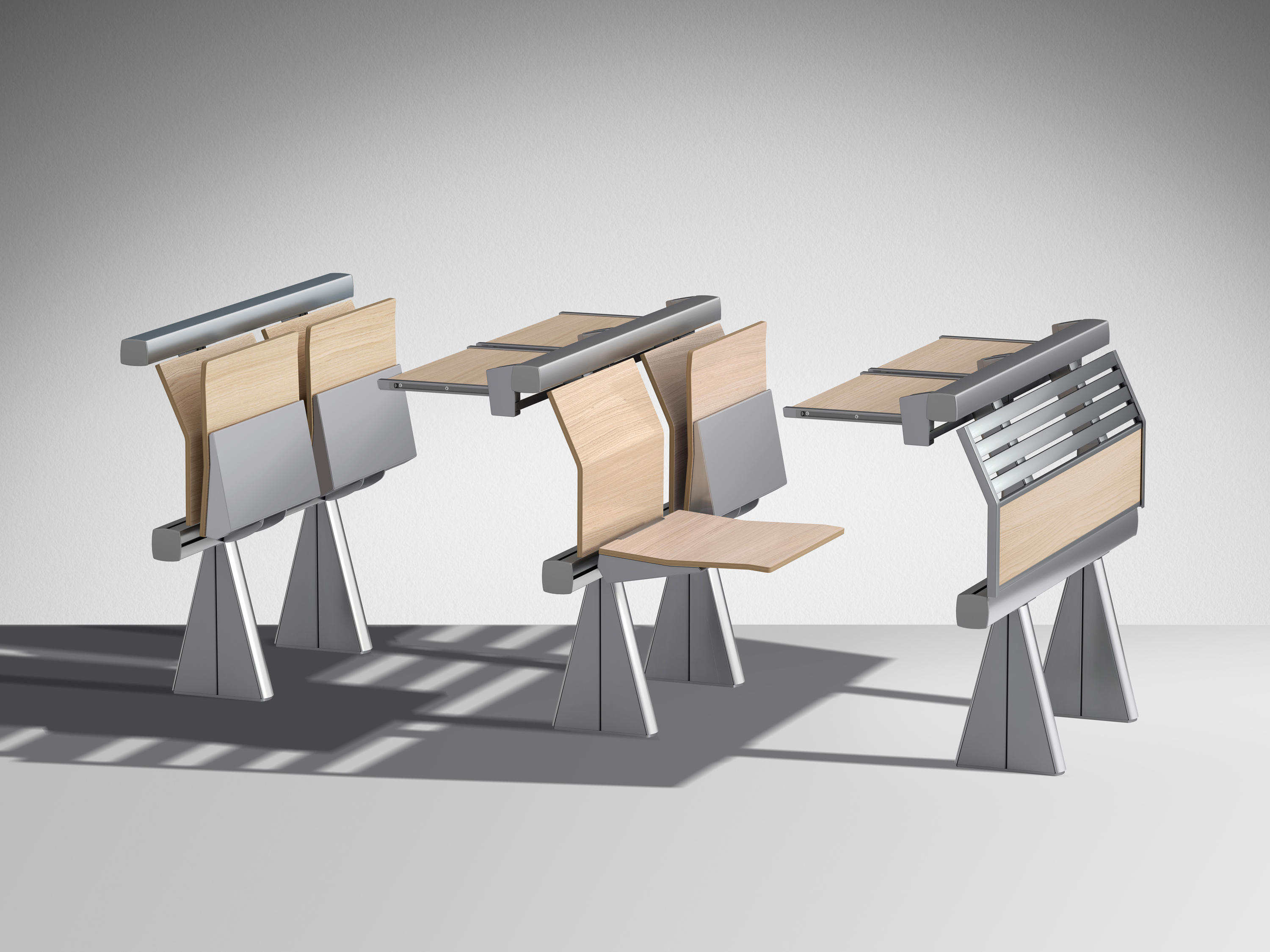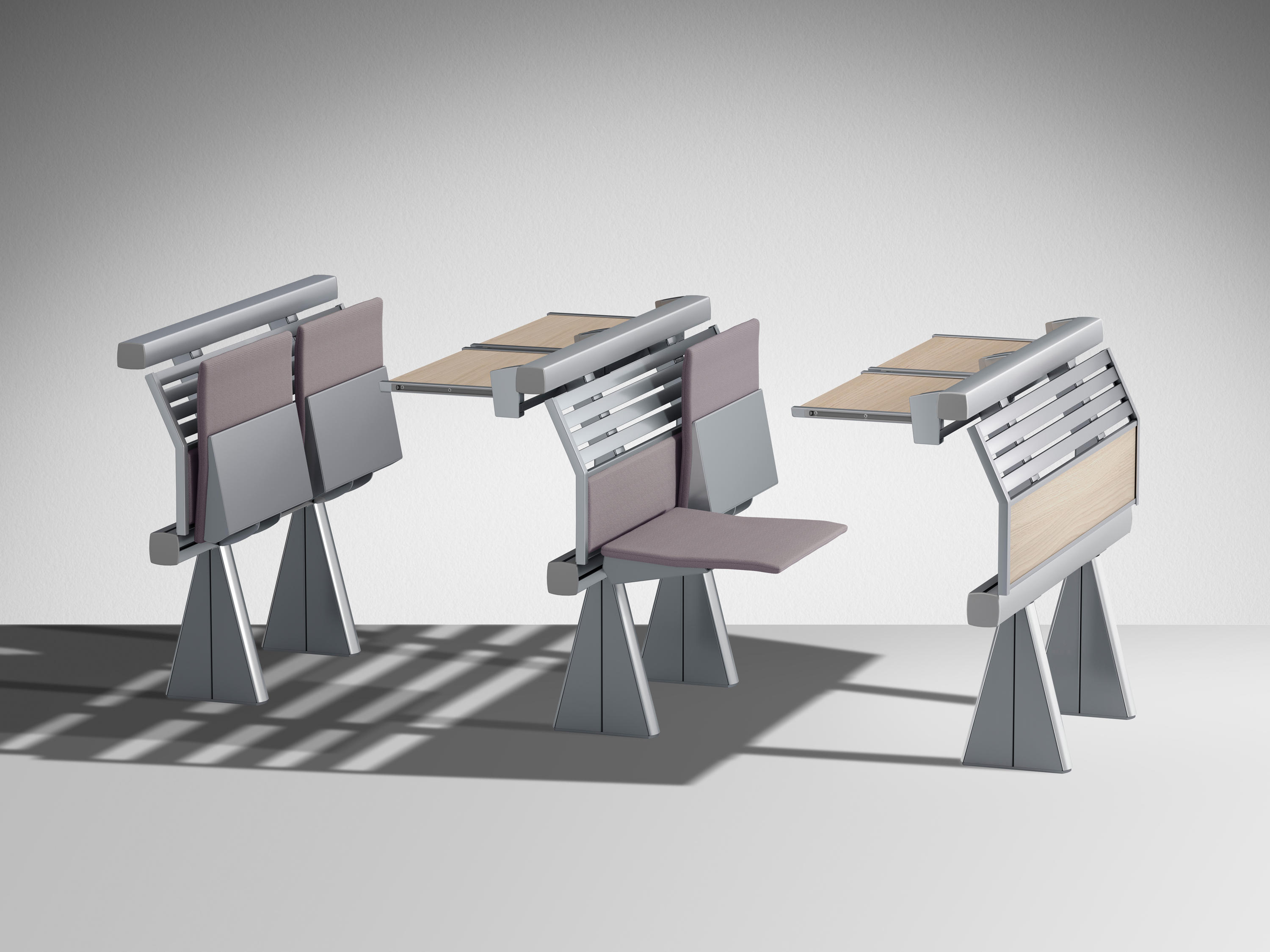 创新的座椅和桌子集成系统,采用新概念结构布局设计,简化装配操作,允许多种组合可能性。超越模块化,在克服与模块化相关的限制方面超越模块化,它允许无缝隙的连续形状,以流体水平线为特征,适合于均匀和舒适的学习或工作环境。最大自由的组合挤压阳极铝承重结构,有起拱作用和安装辅助元件(立柱、座椅、书写平板、支撑)的通道,无需钻孔或任何预定义的模块化,以保证结构的最大构图自由,甚至在安装过程中。安装可以是一条直线,曲线,在台阶上,也可以是在倾斜地板上(座椅之间的中心到中心距离可以调整)。靠背和座椅连续靠背版本由板条和挤压的、阳极化的铝型材制成,上部和下部采用双叠层或贴面的中密度纤维板。单靠背版采用山毛榉胶合板。两种版本都可以用织物或生态皮革填充和覆盖。Tip-向上座椅自动靠背,并与靠背进行协调。人机工程学设计的后座是按照脊柱的解剖结构设计的,无论使用何种安装配置,都能提供适当程度的舒适性:在水平地板上,在大台阶上,在直线或弯曲的行上。