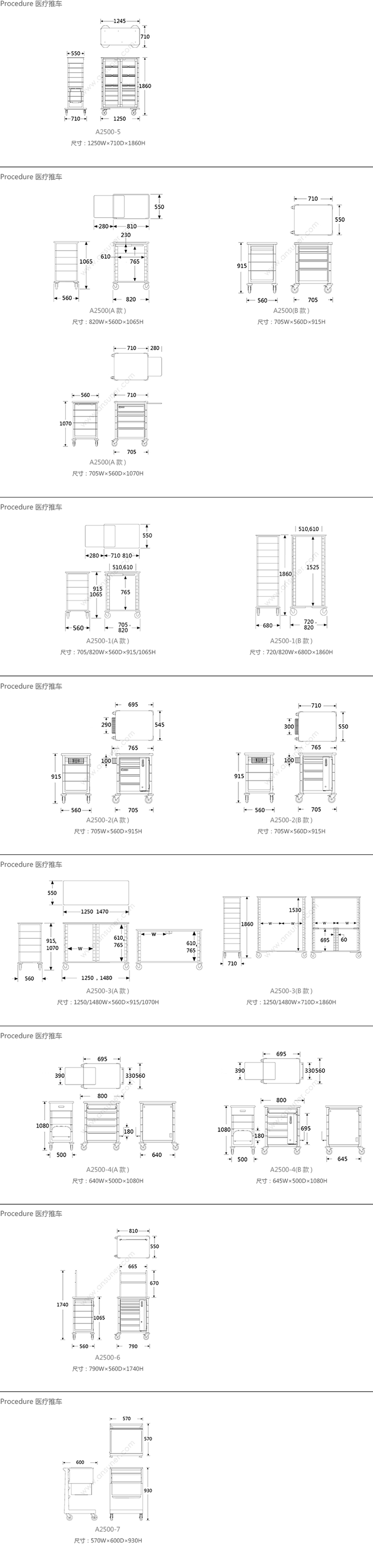 Procedure 医疗推车 系列尺寸/示意图