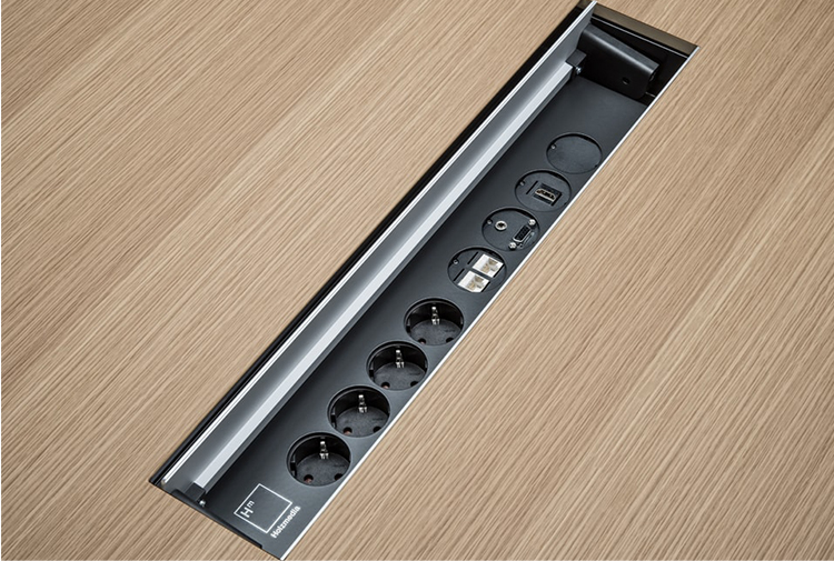 船形或椭圆形为基本形状的高级会议桌,经典椭圆形或长方形脚, 用于隐形电缆布线和技术集成-易于维护.