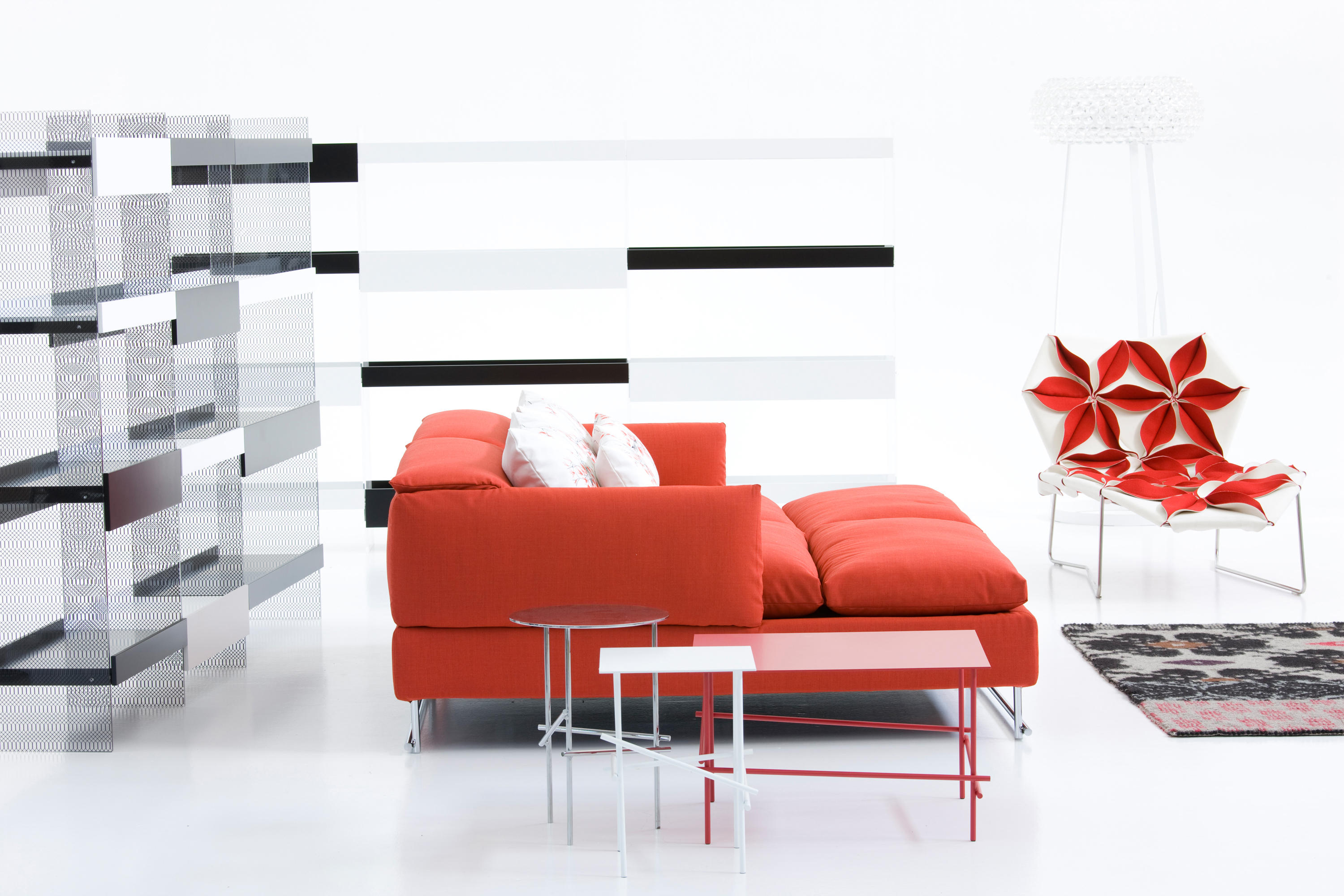 Antibodi 是 Patricia Urquiola 從一個花朵盛開的概念所創作的椅子,蜂窩式三角形花瓣串連縫製而成花朵散播在椅面上,片片花瓣的外型和多層次的材料,衍伸出豐富的圖案。