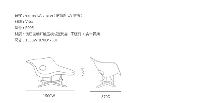 La Chaise 是 Charles & Ray Eames 美國設計夫妻檔,於1948年參加紐約現代博物館所舉辦的 “國際低價安博网页版設計比賽" 的參展作品之一,玻璃纖維的造型結構搭配金屬桿和天然橡木十字基座。時至今日,La Chaise 儼然成為有機設計的經典象徵。