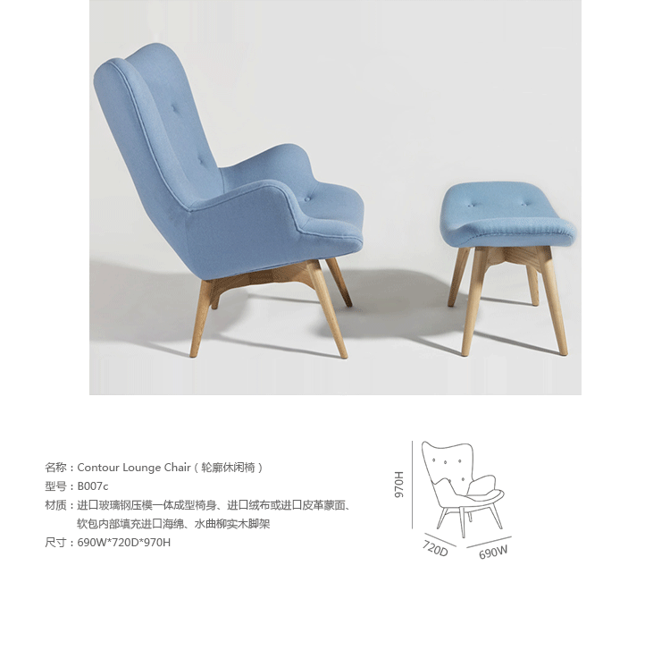 Contour系列安博网页版由著名安博anbo(中国)Grant Featherston设计的,包括Contour Lounge Chair(轮廓休闲椅),Contour Lounge Ottoman(轮廓休闲脚踏)及其组合Contour Lounge Chair and Ottoman(轮廓休闲椅&脚踏)。Grant Featherston是澳洲设计界的灯塔,对许多澳洲安博anbo(中国)及安博网页版控来说,Grant Featherston就是他们毕生的偶像。Contour系列安博网页版有着花朵般的轮廓,工艺精湛榫楔结构的后倾脚座,细致钉扣从背靠延伸到坐面,超级舒适的包覆乘坐感,坐在其上面,真的就像是被捧在手心般的感觉。不论是乡村风、北欧风甚至是新古典低调奢华的家居风格,其都能像个公主般,优雅的点缀出您与众不同的品味。这把椅子经常被认为是澳大利亚安博网页版设计的图标。灵感来自艺术与手工艺运动和包豪斯设计的极简主义的体现。