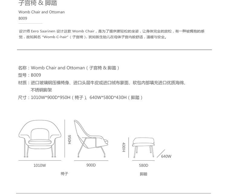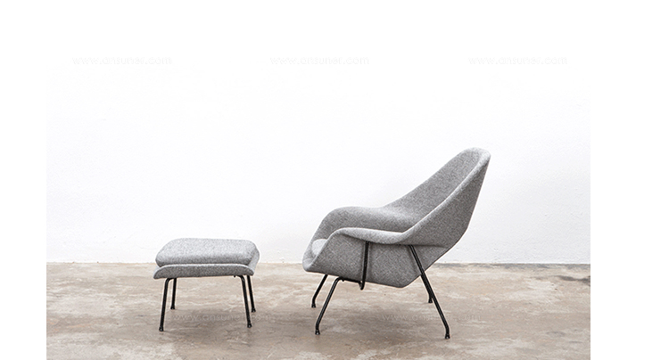 Womb Chair 的基本构造是由抛光镀铬或雾面钢管底座,以一体成型的泡棉包覆框架所组成。 Eero Saarinen 设计这张椅子挑战了一般世俗的规则,打破窠臼,树立了新的现代设计和舒适的标准,充分显示他的高超才华。