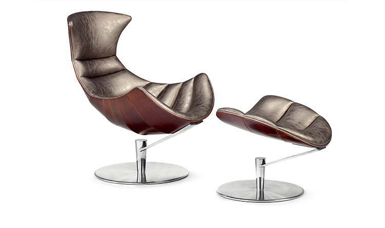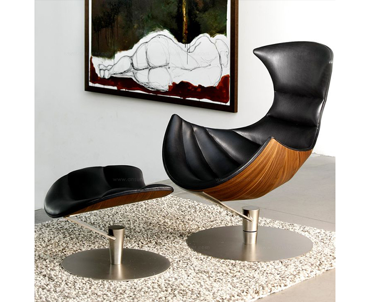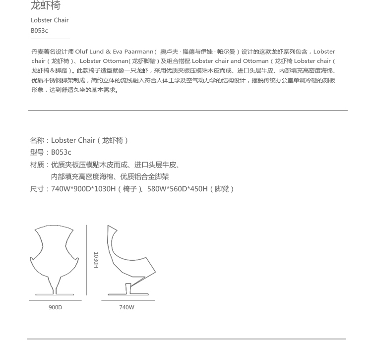丹麦著名安博anbo(中国)Oluf Lund & Eva Paarmann设计的这款龙虾系列包含,Lobster Chair(龙虾椅)、Lobster Ottoman(龙虾脚踏)及组合搭配Lobster Chair and Ottoman(龙虾椅&脚踏)。此款椅子造型就像一只龙虾,采用优质夹板压模贴木皮而成、进口头层牛皮、内部填充高密度海棉、优质不锈钢脚架制成,简约立体的流线融入符合人体工学及空气动力学的结构设计,摆脱传统办公椅单调冷硬的刻板印象,达到舒适久坐的基本需求。