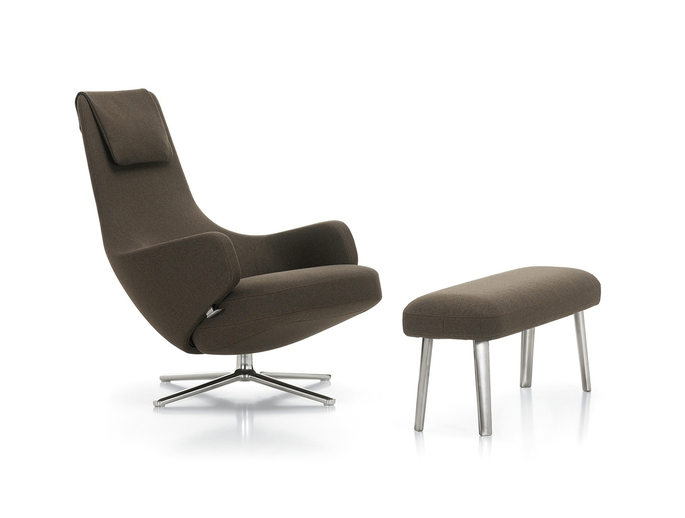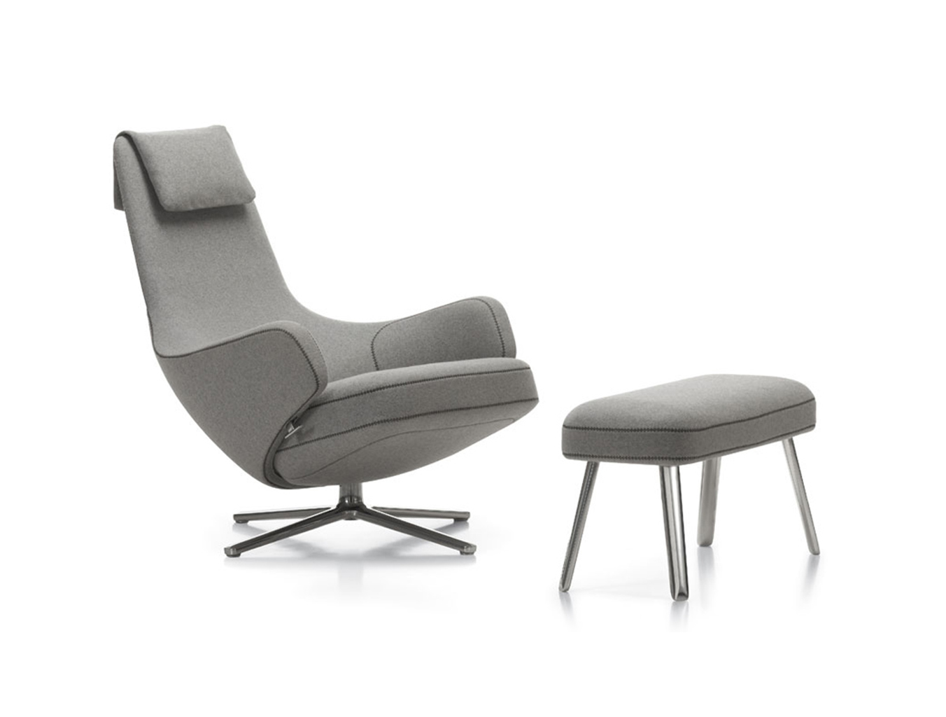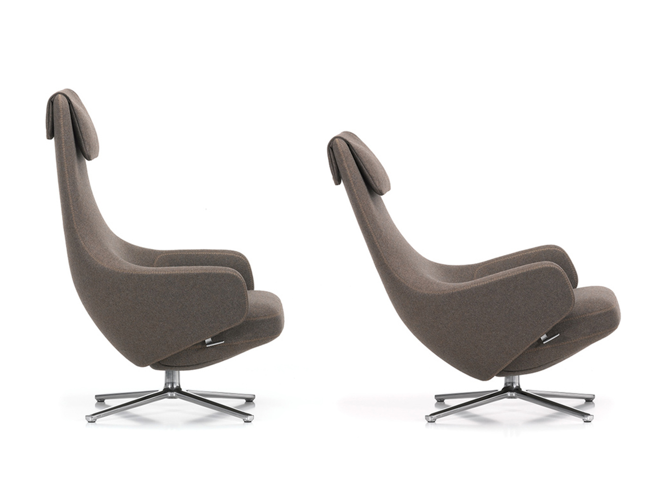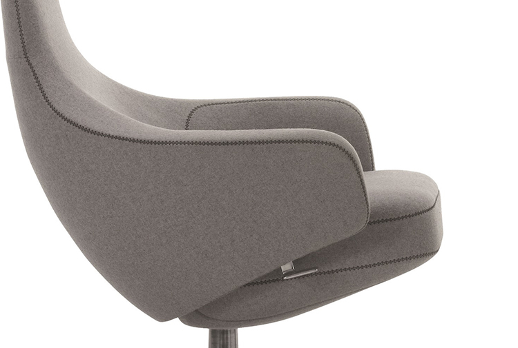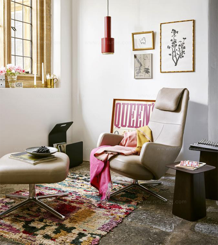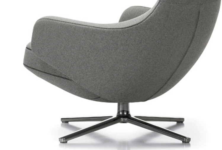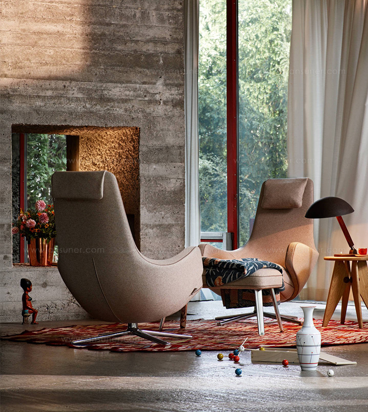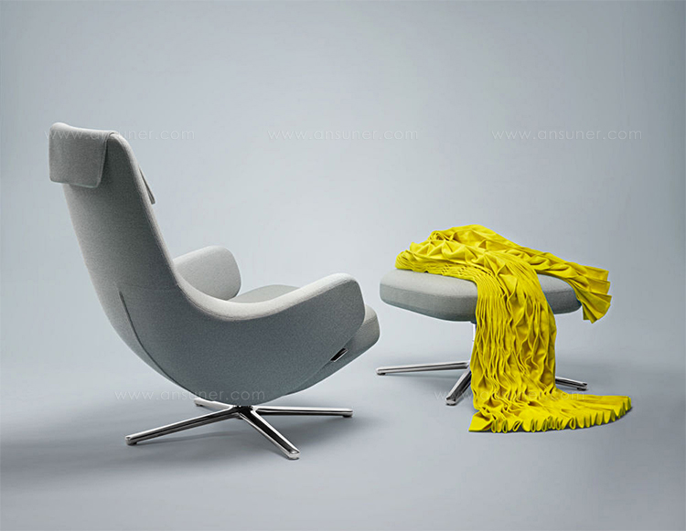 "repos lounge chair and ottoman(repos休闲椅&脚踏)由设计大师Antonio Citterio所设计。repos系列休闲椅采用钢制铝合金脚架、聚氨酯海绵填充、高级布艺扪面,可随意调整坐姿和高度,也可以放平躺,配上舒适的羽毛衬垫,无论阅读或者休憩,都非常舒服,符合人体工学,高档舒适,是办公,会议的理想选择。意大利安博anbo(中国)和建筑师 Antonio Citterio赋予了这边椅子永恒的优雅气质与无与伦比的舒适,是当代设计的经典,无论用在办公、商业、家庭都是非常高贵大气的。
