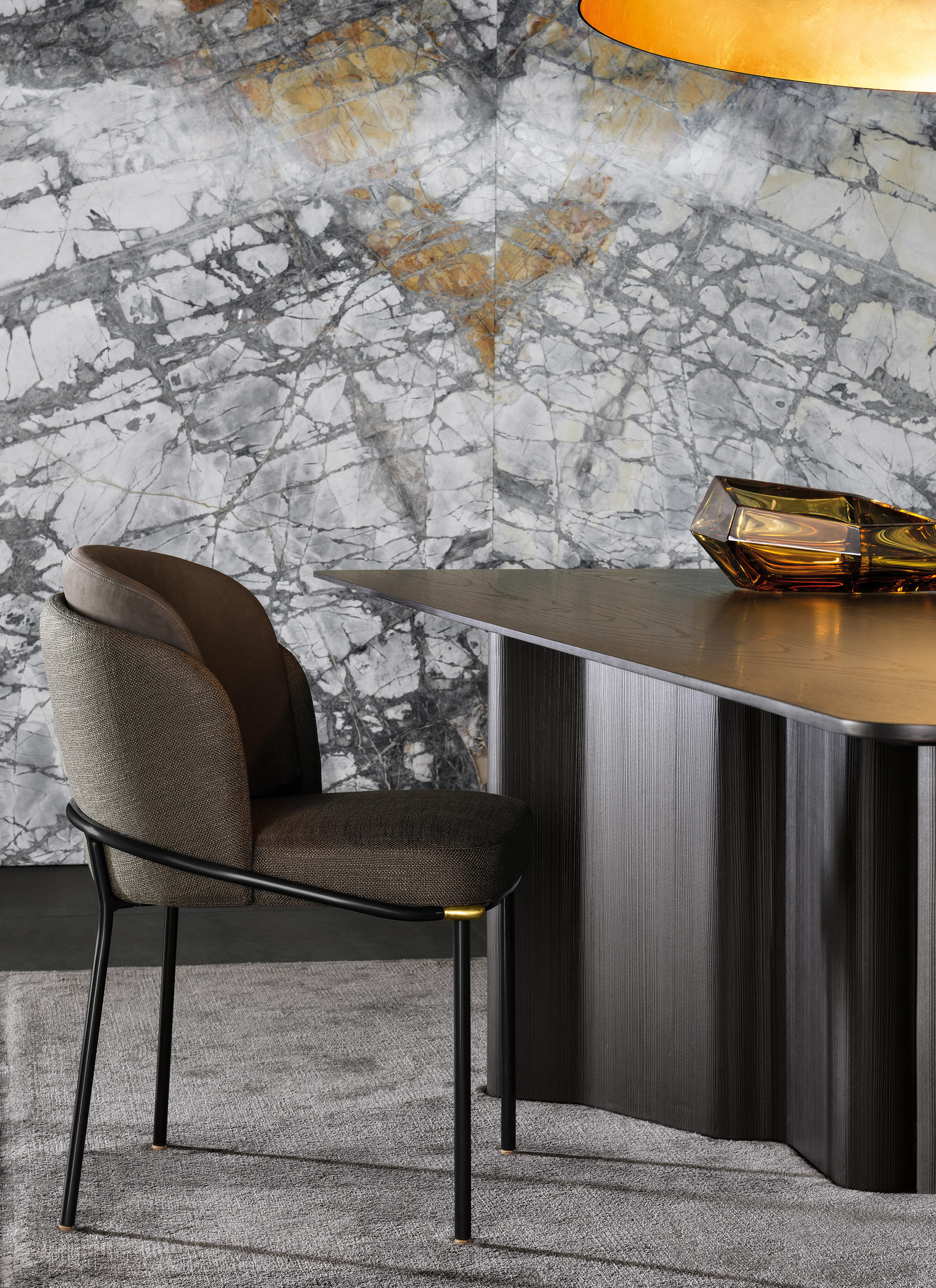 软垫座椅搭配优雅修长的椅腿,其材质为亚光黑色的金属管,亮光金色、黑镍金属色或浅铜色的细节使其倍显精致。