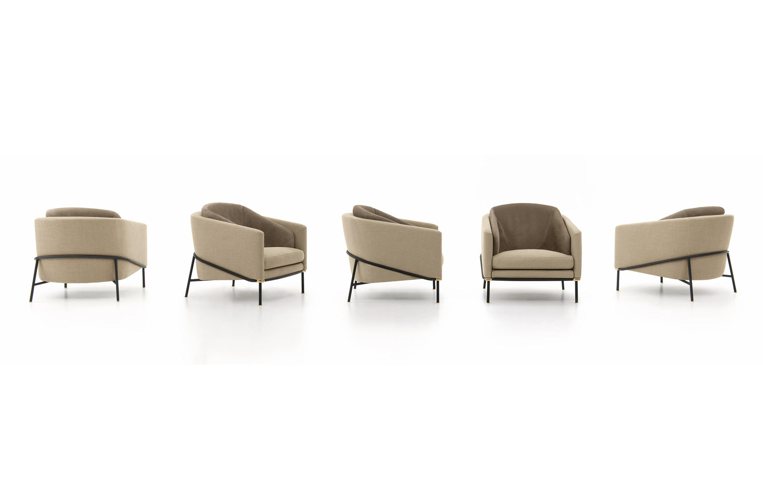 造型与功能和谐地融合在一起,打造出环抱式的靠背和舒适的椅面,两者皆采用金属结构和聚氨酯泡沫。 内部靠垫结构采用热塑成型材料和聚氨酯泡沫制成,进一步提升靠背的舒适度。