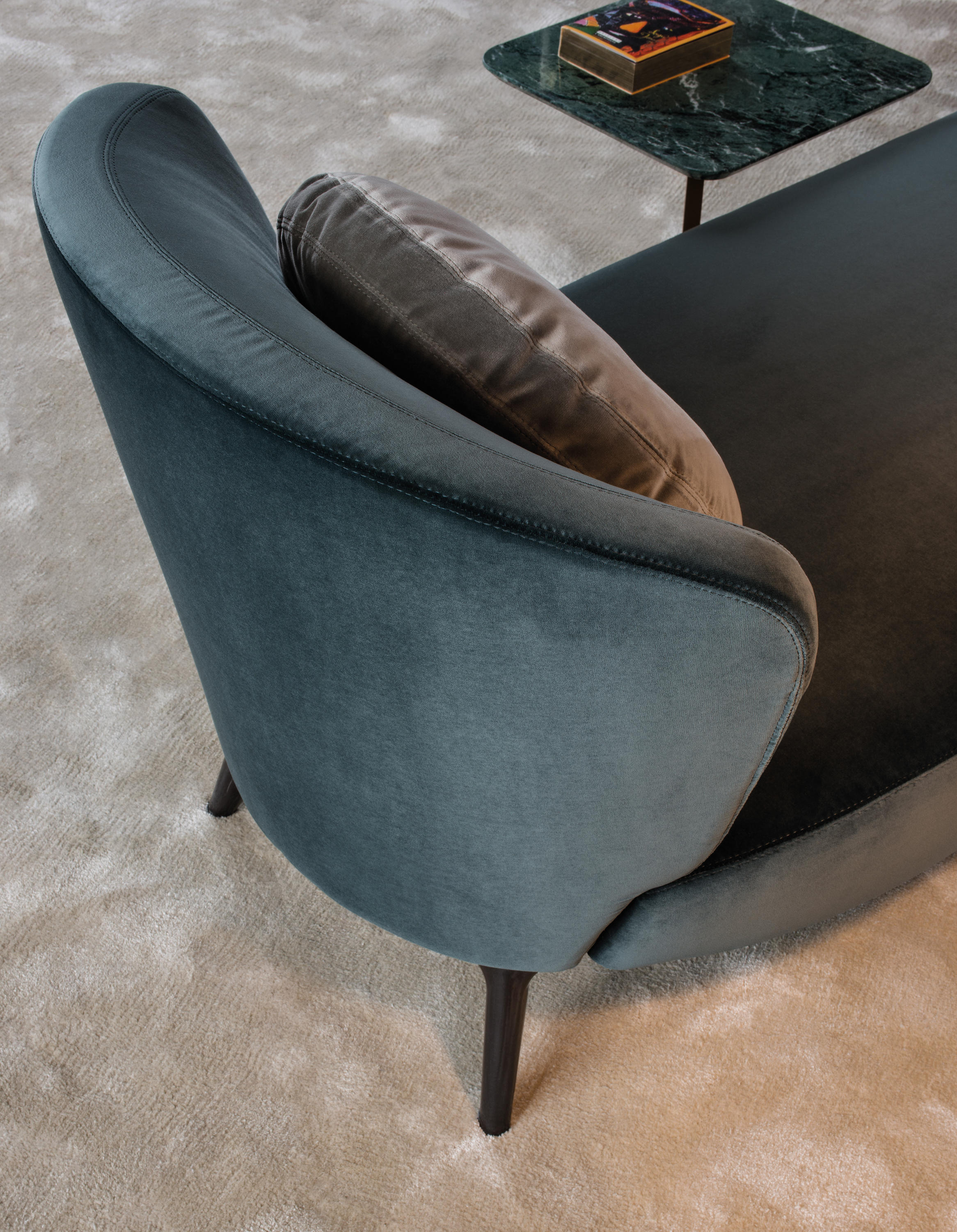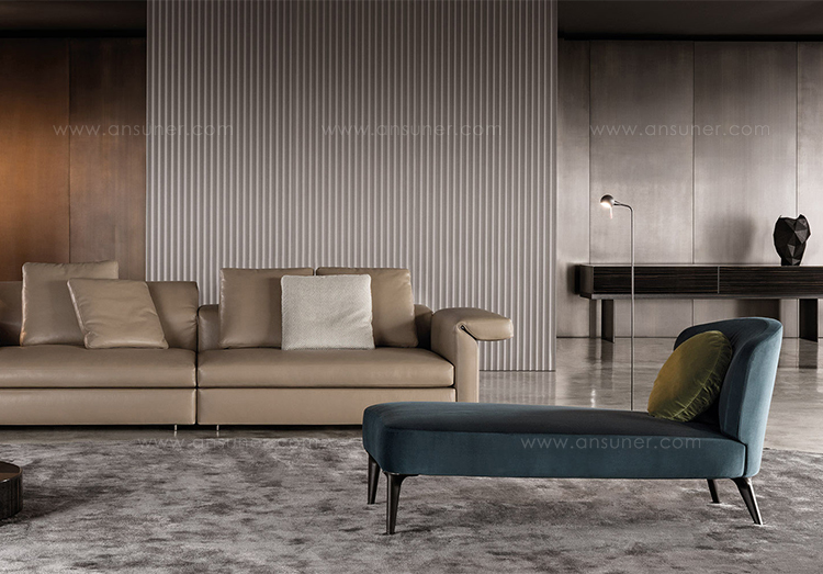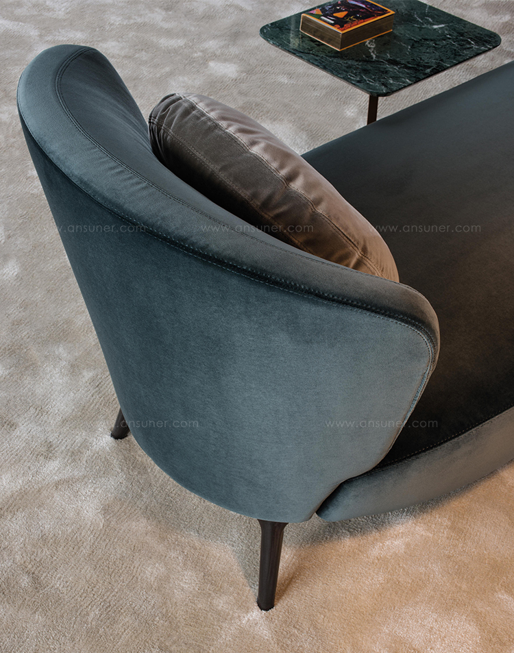 沙发的围裹式靠背特色十足,扶手线条与之完美呼应,以蓝灰色调呈现的压铸铝合金支脚尽展精致设计之美。