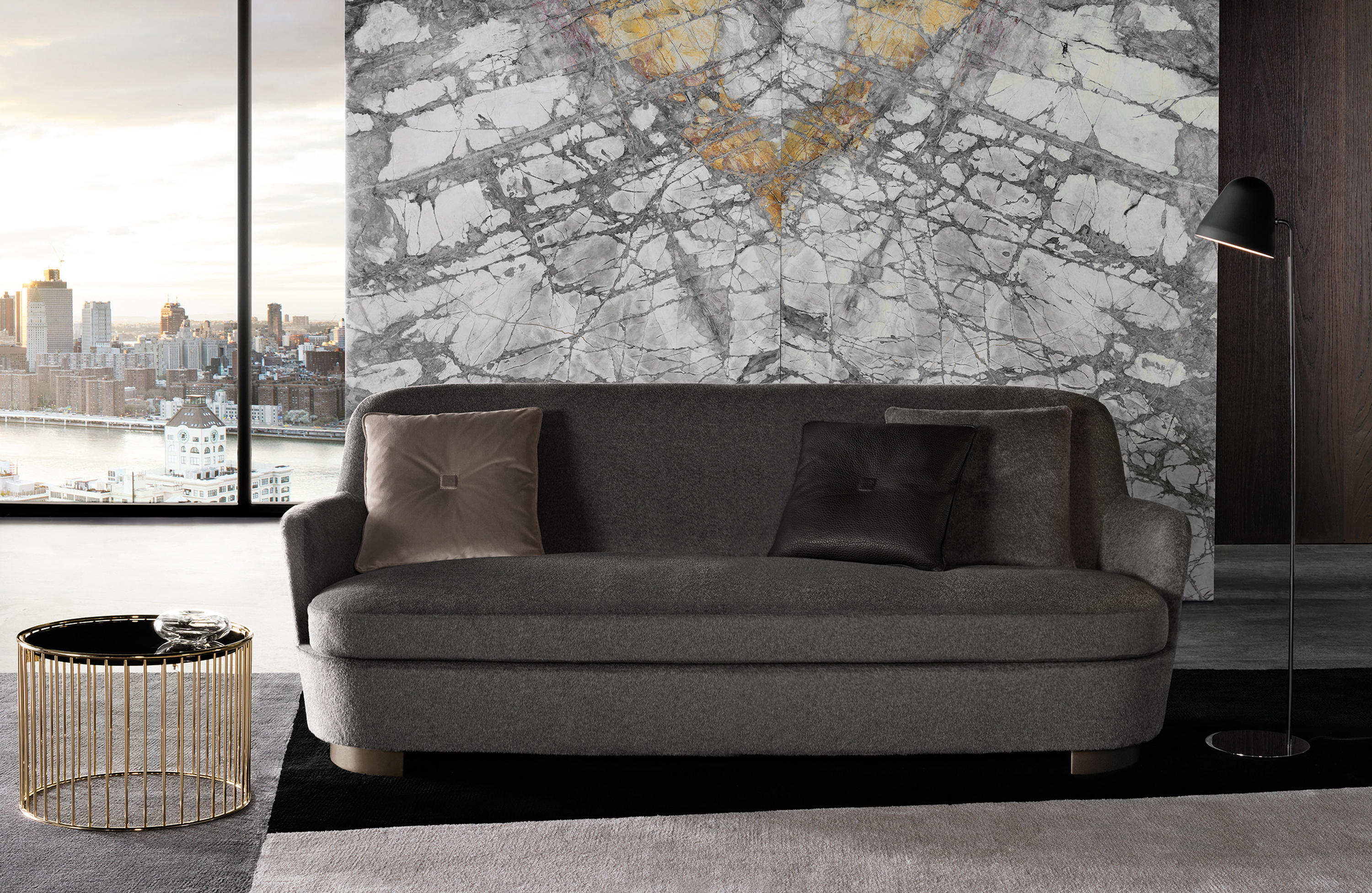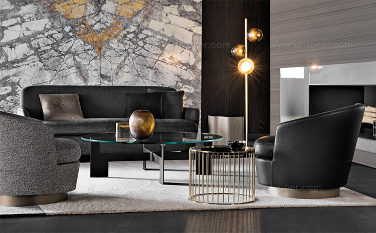 柔和的造型、紧凑的比例和具有视觉冲击力的细节呈现出精致的美学语言,金属基座采用淡铜色的表面设计。