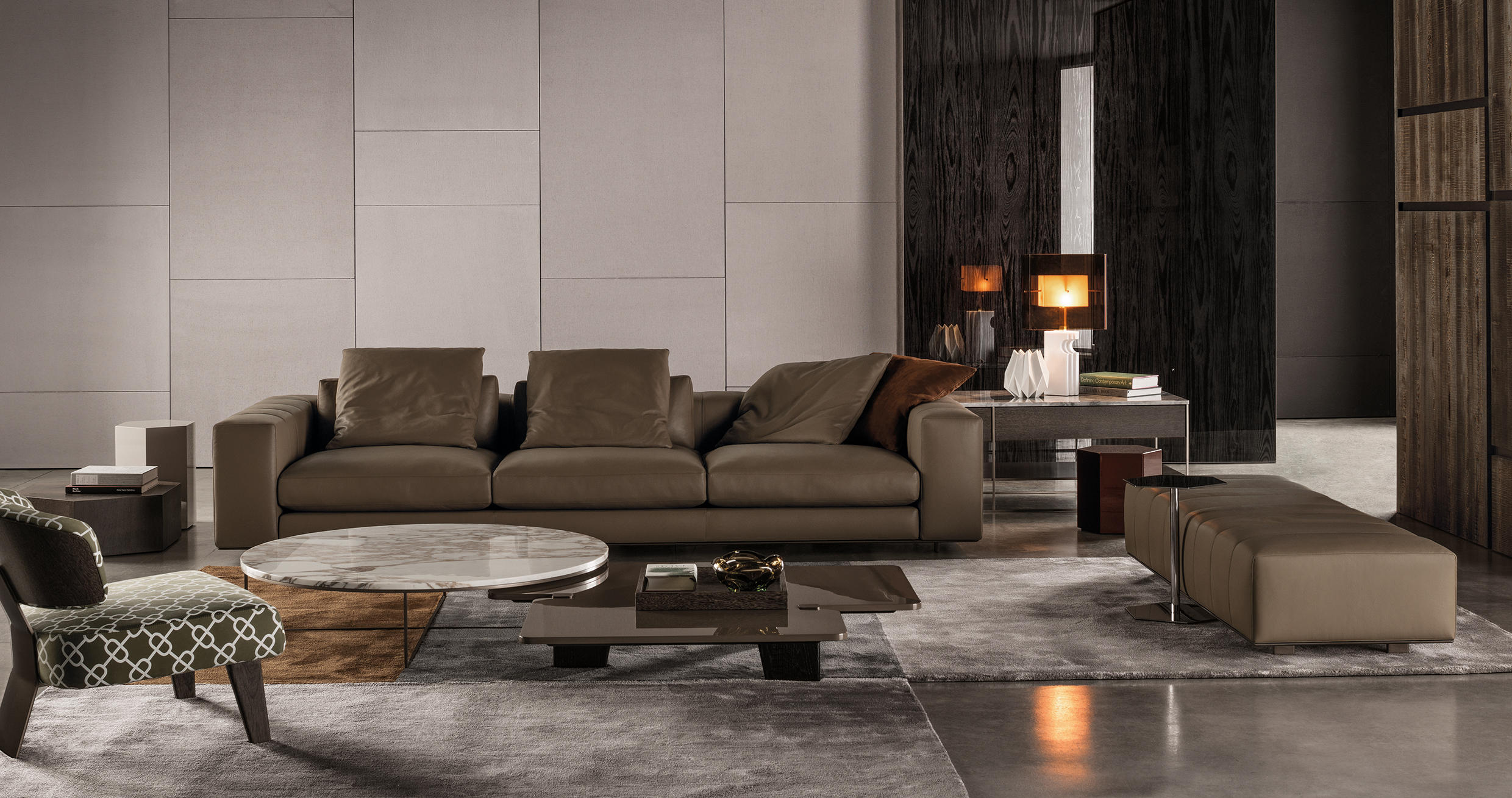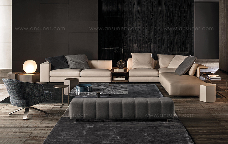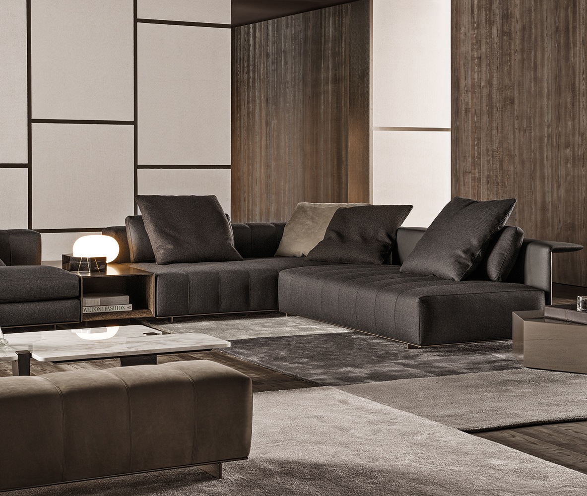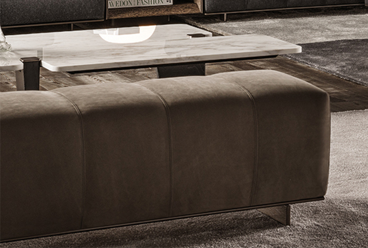 弗里曼“裁缝”项目的理念和原创性在其衍生系列弗里曼“休息室”中也有所体现。弗里曼“休息室”沙发纵深度有所降低,不仅更易搭配较小的居住空间,还可以用在接待场所,如等候室、前台区域、行政办公室。单组沙发的特点在于采用规则图形纹样的优雅缝线设计,可以自由随性地组合沙发,打造灵动的造型。“Wing”扶手拥有轻盈的线条,这要得益于采用聚氨酯为基材的泡沫金属框架。精致的包覆材料展现出公司运用复杂面料进行剪裁加工的实力。皮革和织物面料的各个部件通过浅铜色人造皮革束带和双缝线工艺连接在一起,打造出独特的纵深效果。