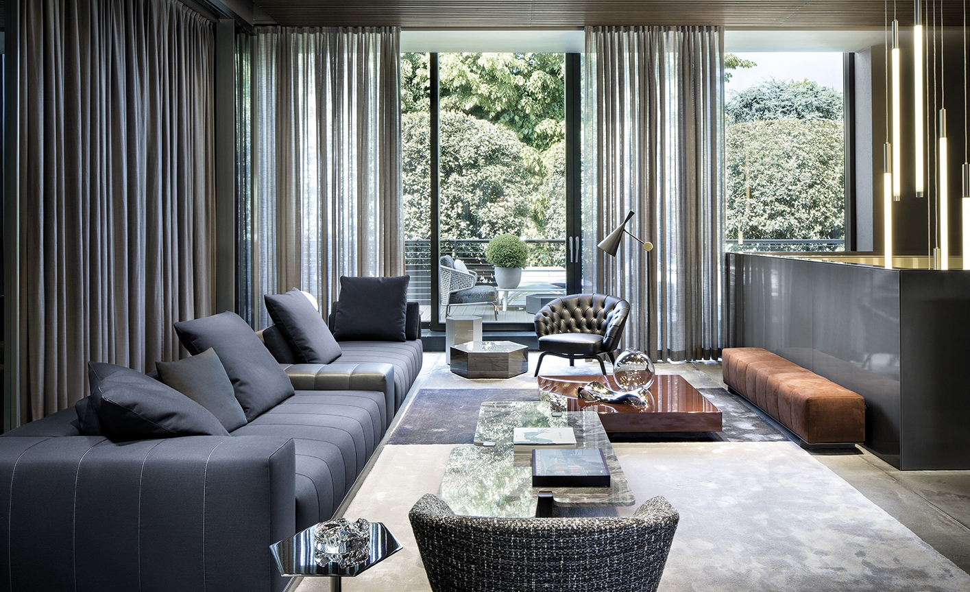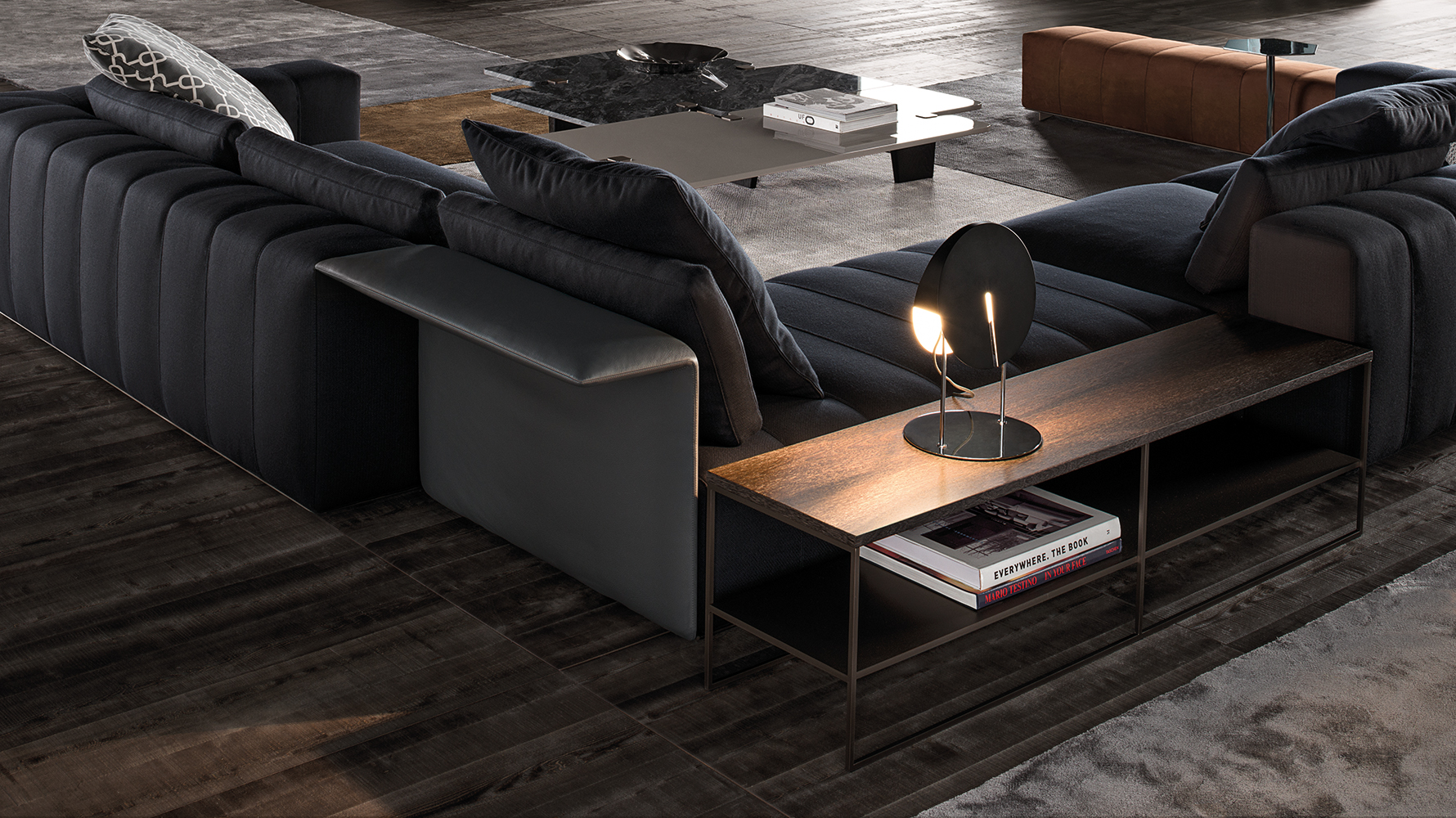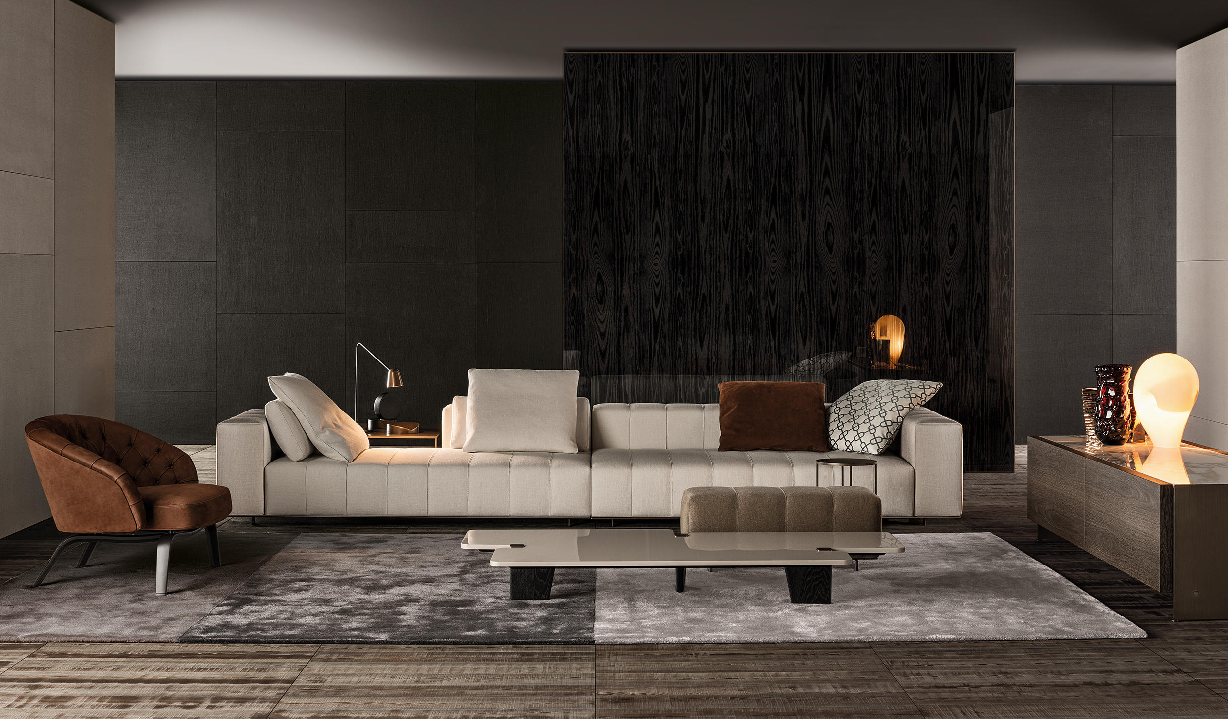 弗里曼“裁缝”项目的理念和原创性在其衍生系列弗里曼“休息室”中也有所体现。弗里曼“休息室”沙发纵深度有所降低,不仅更易搭配较小的居住空间,还可以用在接待场所,如等候室、前台区域、行政办公室。单组沙发的特点在于采用规则图形纹样的优雅缝线设计,可以自由随性地组合沙发,打造灵动的造型。“Wing”扶手拥有轻盈的线条,这要得益于采用聚氨酯为基材的泡沫金属框架。精致的包覆材料展现出公司运用复杂面料进行剪裁加工的实力。皮革和织物面料的各个部件通过浅铜色人造皮革束带和双缝线工艺连接在一起,打造出独特的纵深效果。
