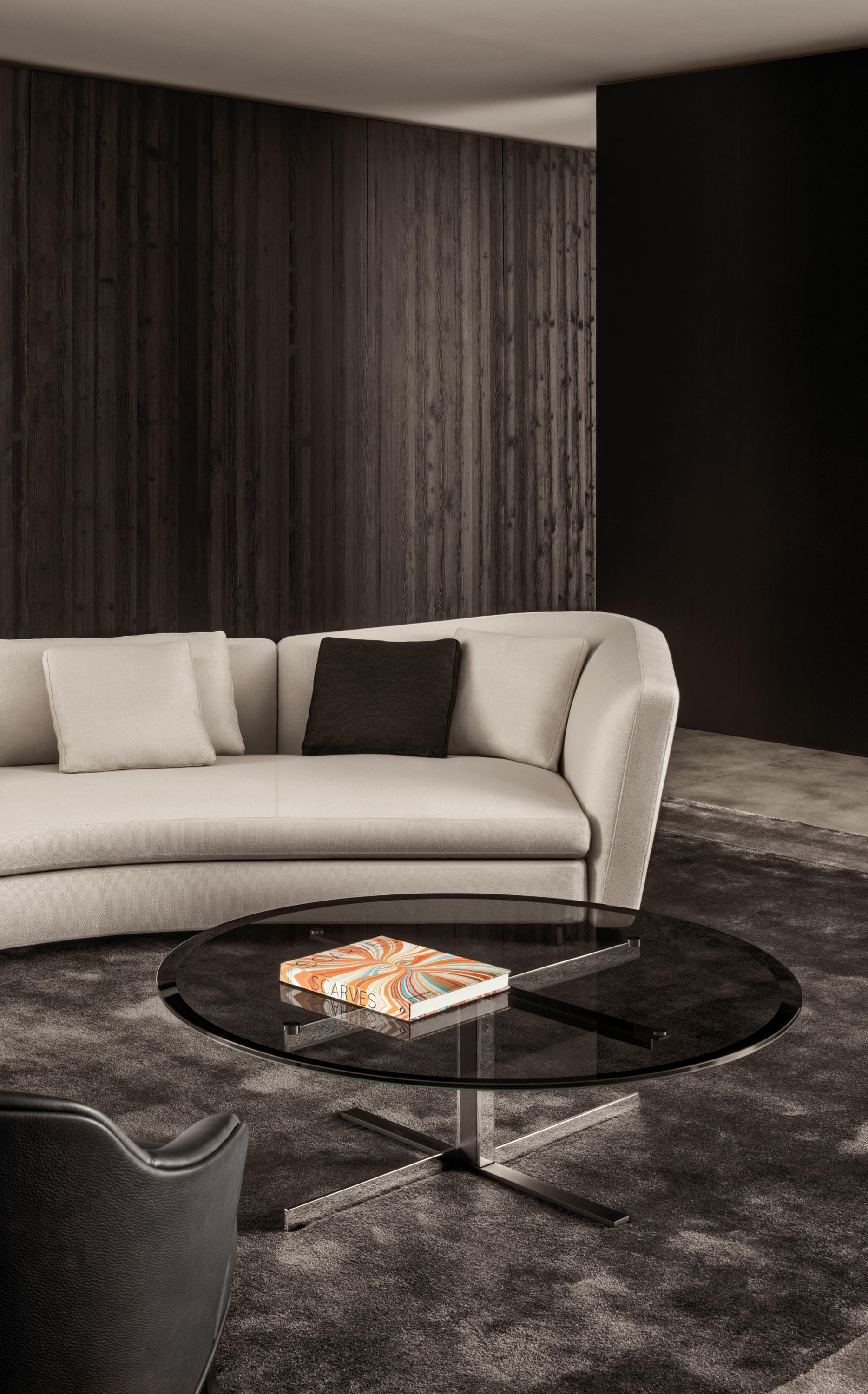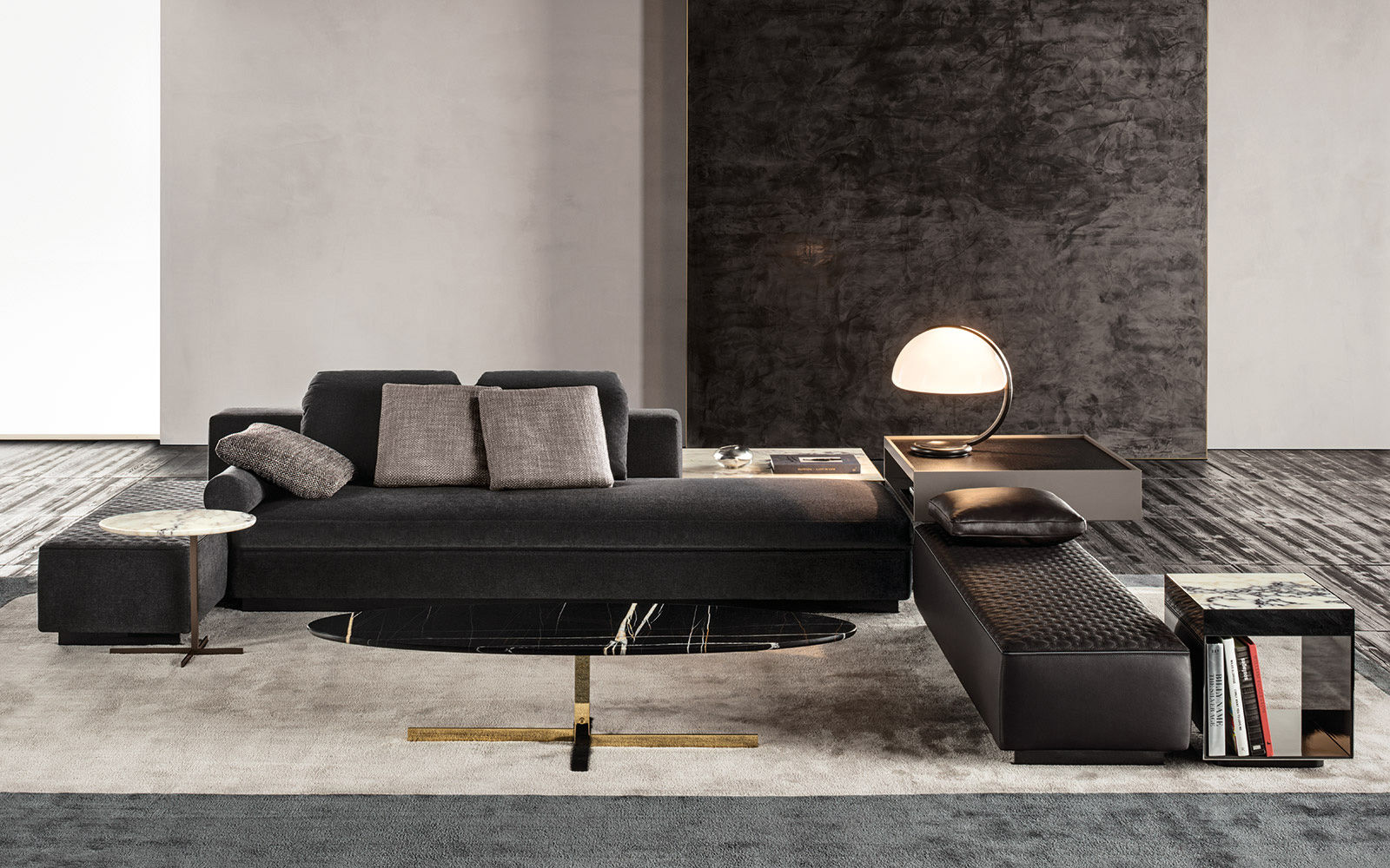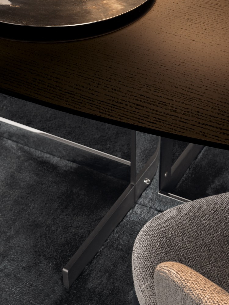 这组边几系列简洁洗练,材质的选择展现出精致的典雅。如果说Catlin边几的设计崇尚简洁,那么材质的选择则旨在打造非凡的视觉和触觉效果。金属基座有着精致的十字形地面支撑腿,其中包括颇有趣味的组合:黑色压花搭配铬色或金色的抛光表面,打造出多种多样的风格。材料的搭配体现出非凡的优雅感,台面可以选择烟灰色的玻璃材质,或是选择两种珍稀名贵的大理石,Arabescato Purple或Sahara Noir,两者都拥有抛光表面。Catlin系列有圆形和椭圆形两种造型,有不同的尺寸可供选择,正如边柜和餐桌一样有多种类型。