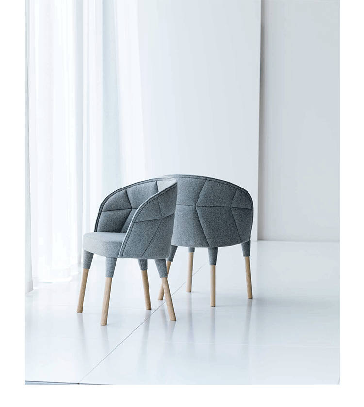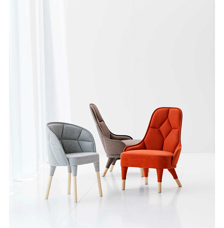 “Emily is our Emma easy chair’s little sister. just like siblings, they are similar but still different. The family likeness can be seen in the needlework: they are both upholstered, but differently pat- terned. The needlework is a function which also creates a powerful idiom. The special technique employed is based on a classical craft, while at the same time occupying the leading edge of technology. Emily is a comfortable chair, equally successful round the dining table and at a conference table.”