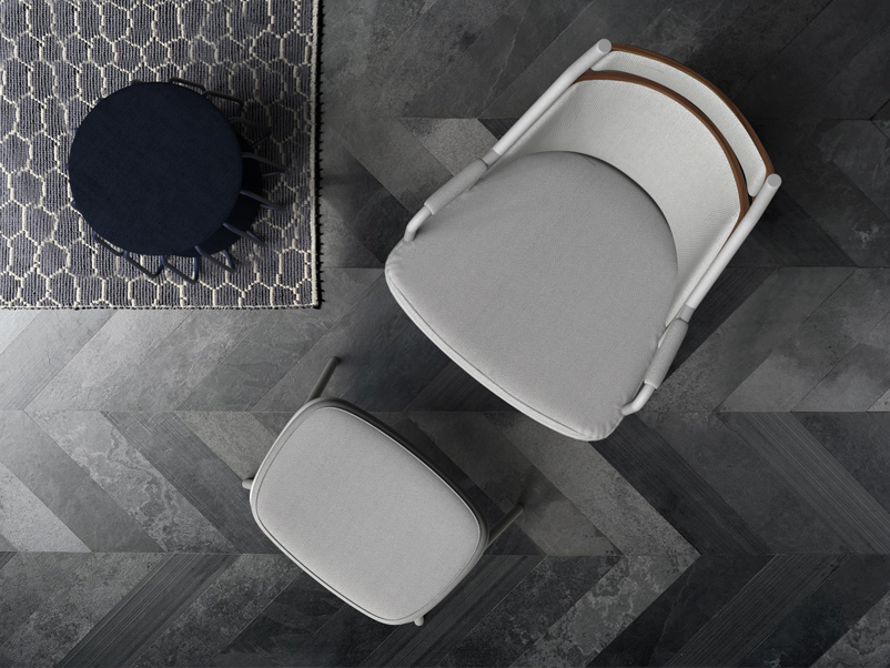 Zafra lounge is certainly characterized by the position of the legs and metal frame which stylize the the seat design. Uniquely the front leg cross diagonally the chair up to the headrest.