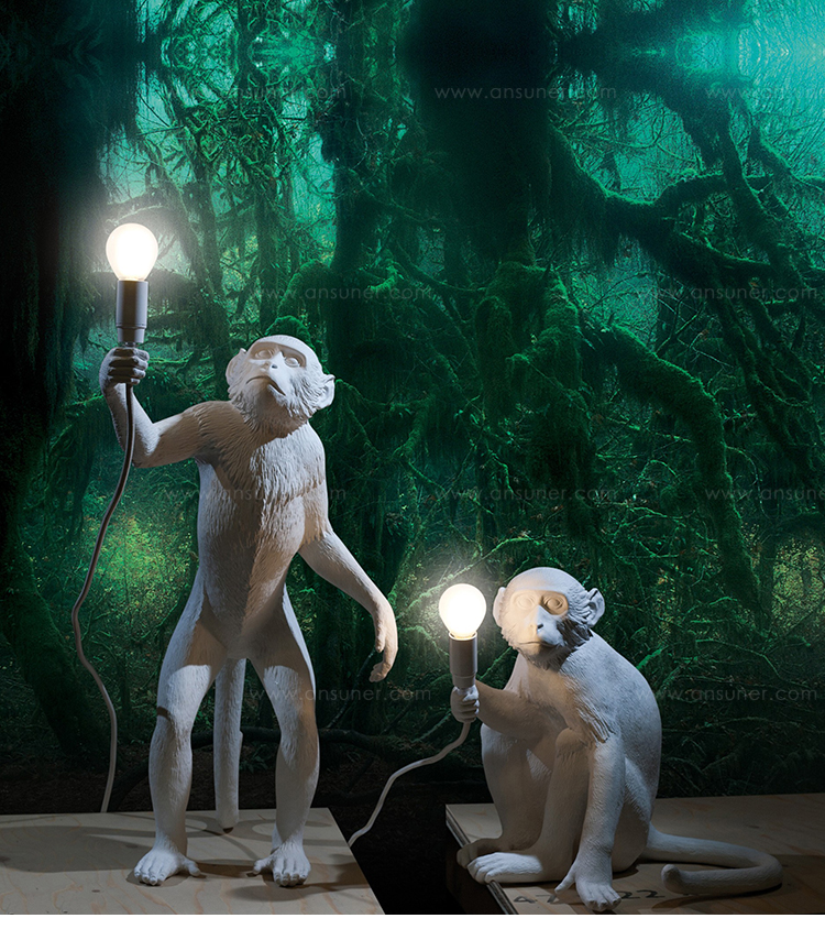 这款猴灯由树脂制成,手工完成,描绘了一只猴子在三个不同的位置,一边抓着一个LED灯泡,一边探索周围的环境,一种新的、替代的照明方式。