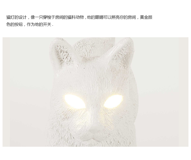 猫灯的设计,像一只穿梭于房间的猫科动物, 他的眼睛可以照亮你的房间,黄金颜色的按钮,作为他的开关.