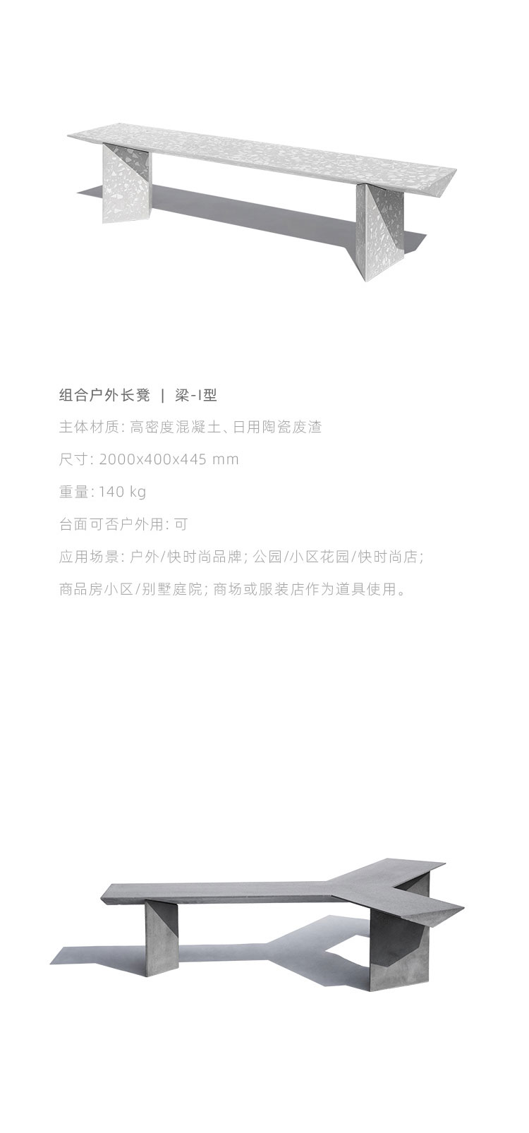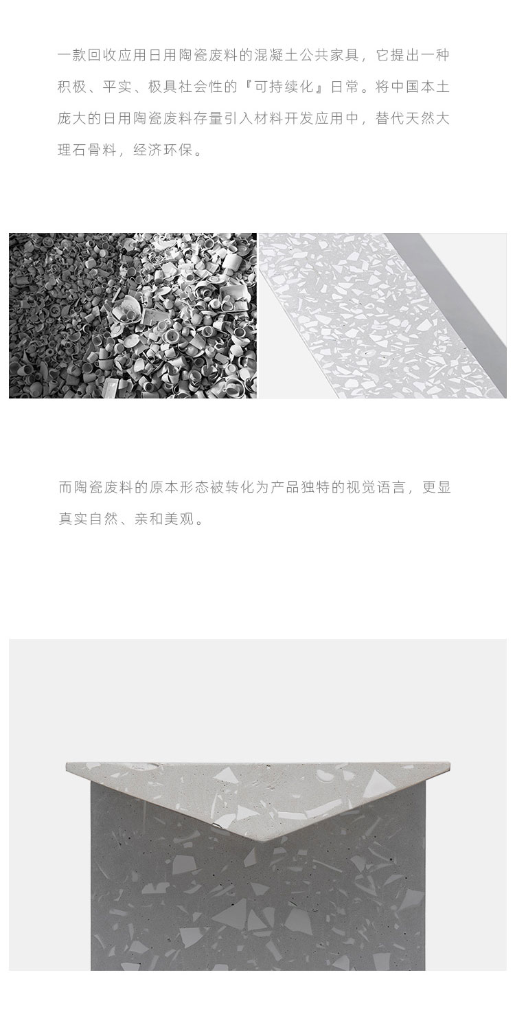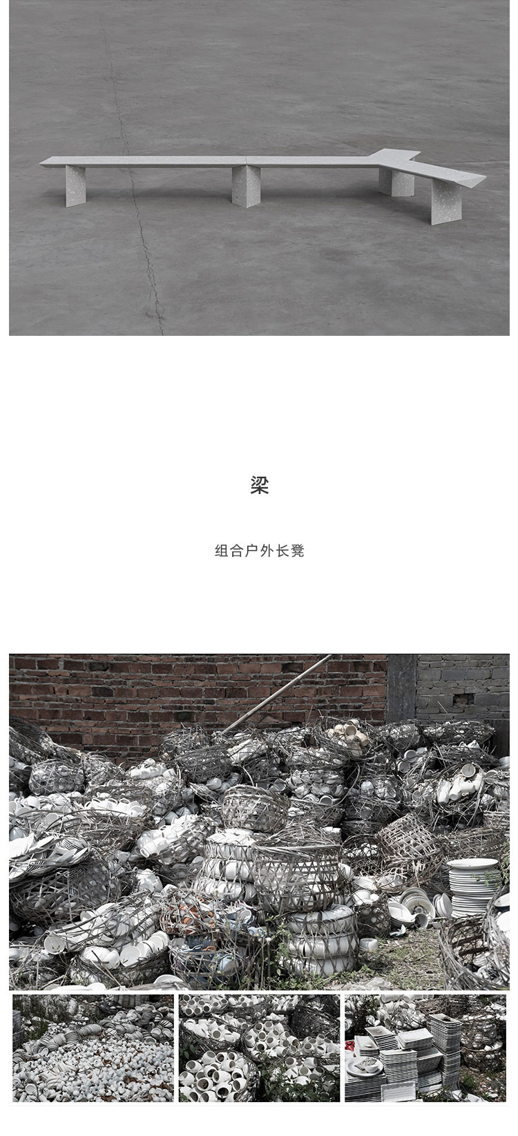 『梁』组合式户外长凳是一款回收应用日用陶瓷废料的混凝土公共安博网页版,它提出一种积极、平实、极具社会性的『可持续化』日常。 将中国本土庞大的日用陶瓷废料存量引入材料开发应用中,替代天然大理石骨料,经济环保;而陶瓷废料的原本形态被转化为产品独特的视觉语言,更显真实自然。