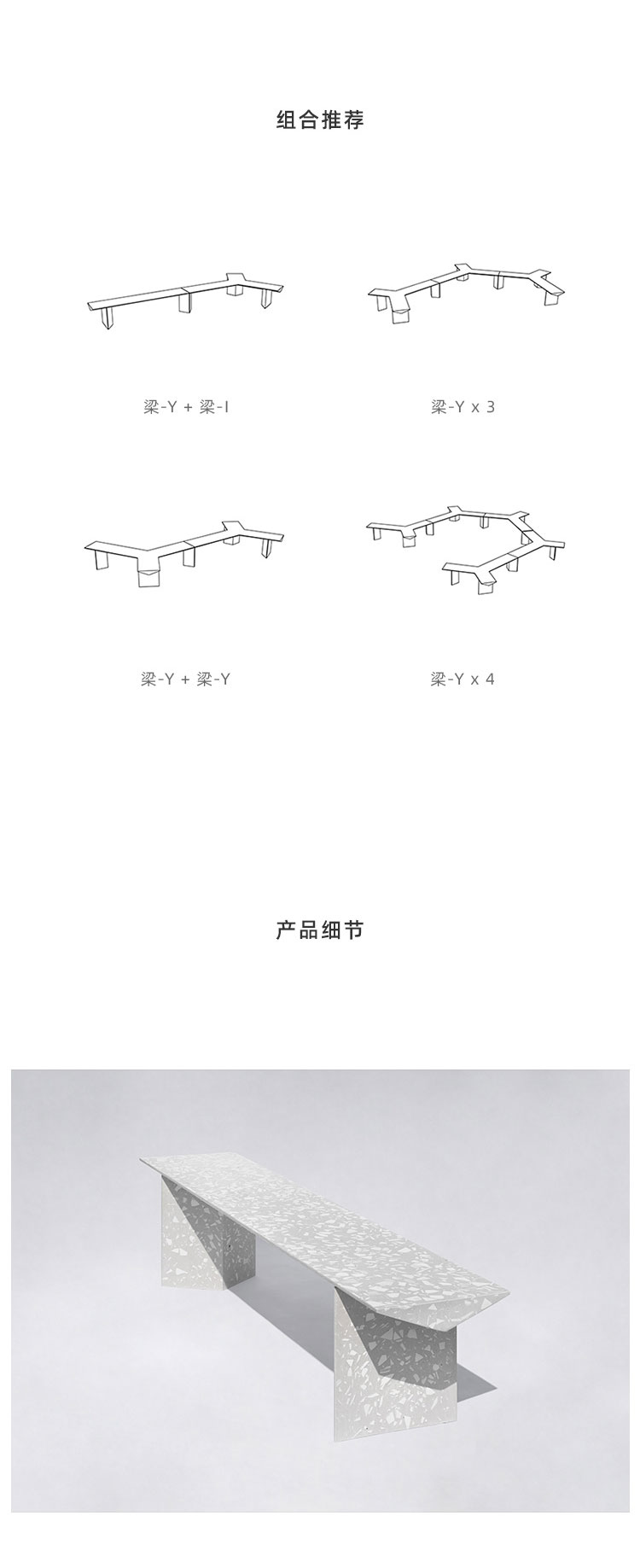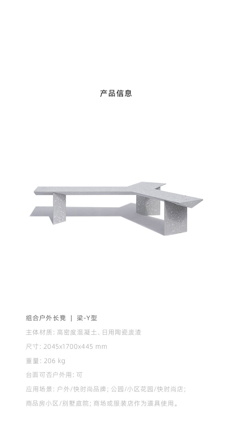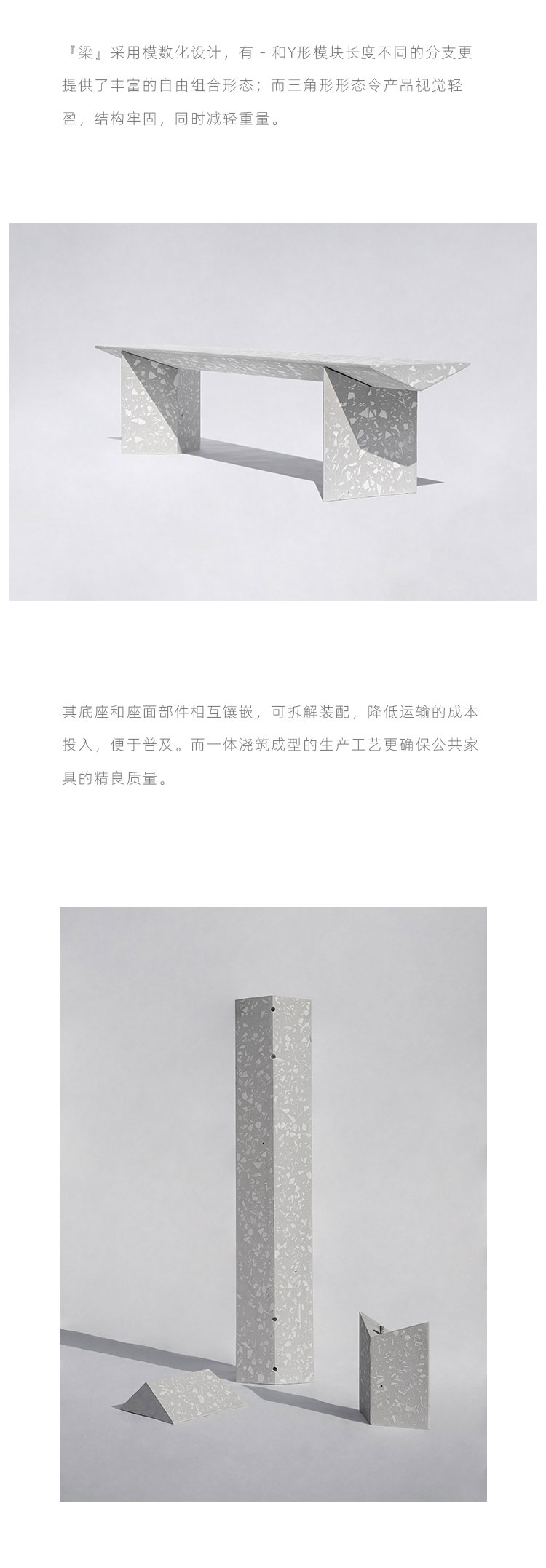 『梁』组合式户外长凳是一款回收应用日用陶瓷废料的混凝土公共安博网页版,它提出一种积极、平实、极具社会性的『可持续化』日常。 将中国本土庞大的日用陶瓷废料存量引入材料开发应用中,替代天然大理石骨料,经济环保;而陶瓷废料的原本形态被转化为产品独特的视觉语言,更显真实自然。