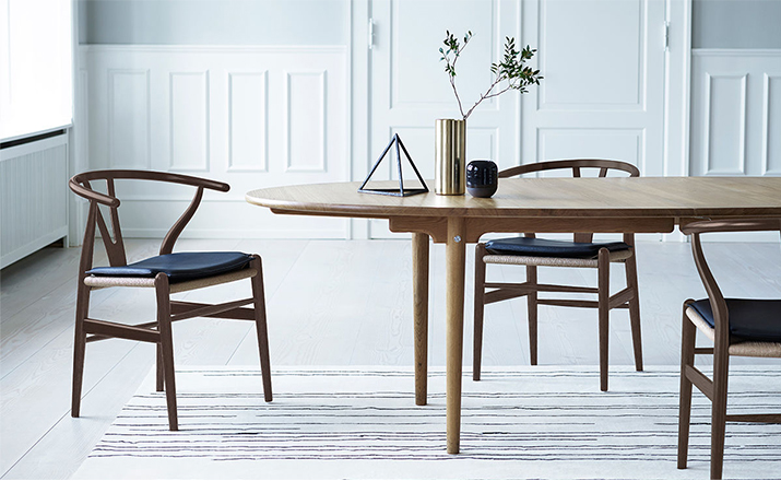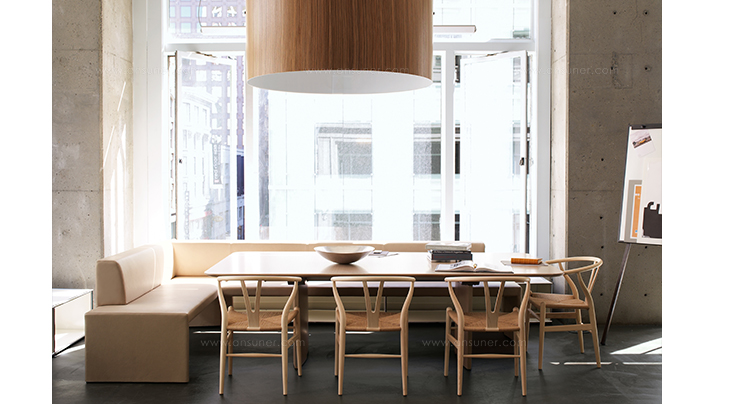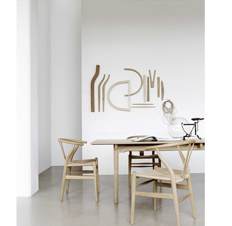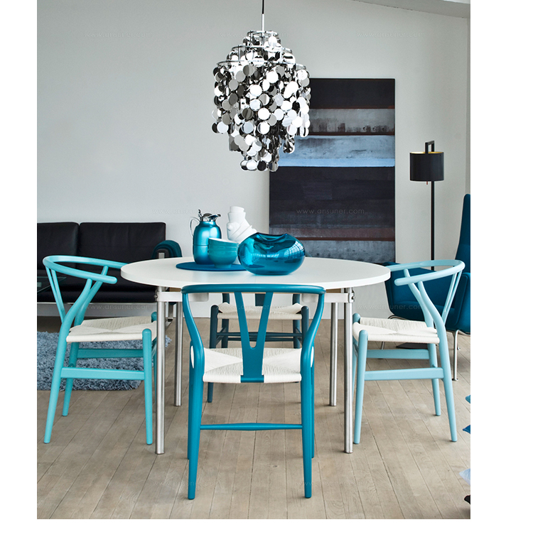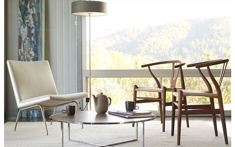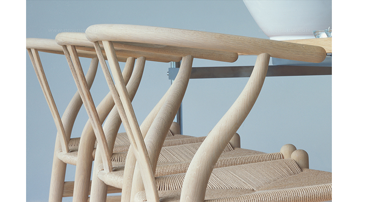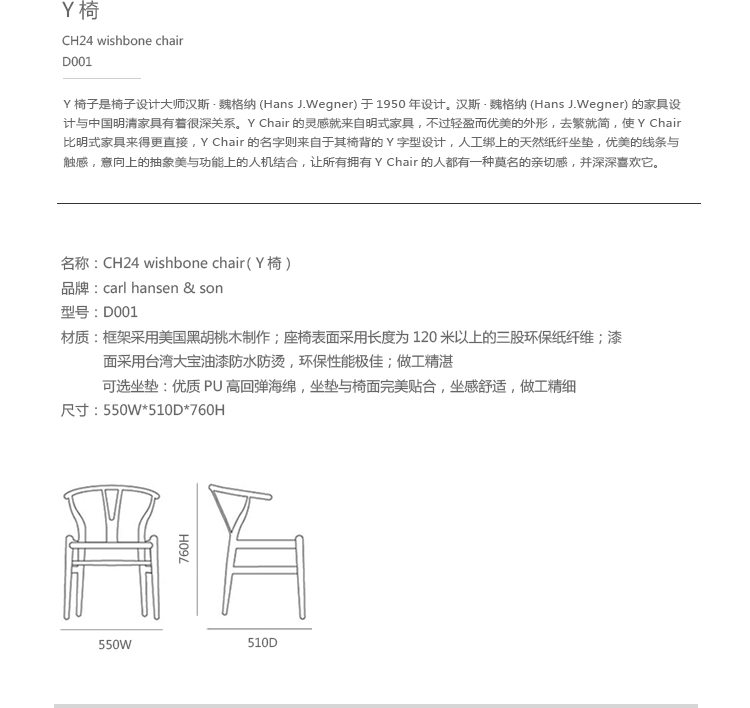 Y椅子是Hans J.Wegner最著名的作品。 它具有重量轻、有吸引力、舒适、中式风格等特点。 该款设计灵感来源于中国传统安博网页版,四平八稳,古色古香,大气自然。上圆下方,浑然天成,深受中国顾客喜欢。Y椅关键在于是工艺与简约的设计,有着清晰的线条。 尽管椅子简约的外观要超过100个步骤进行。除其他事项外,手工编织座垫超过120米的线。 材料有丹麦硬木(橡木,榉木,水曲柳)以及北美硬木(胡桃木,樱桃木)等。外表可漆成各种各样的颜色。 垫子的座位可以添加额外的舒适。
