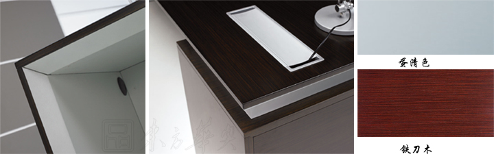 ※ 上图为班台细节展示图,蛋清色和铁刀木双色漆搭配出跳跃的颜色感,漂亮而清爽。配置调动线盒,内部配置可选!