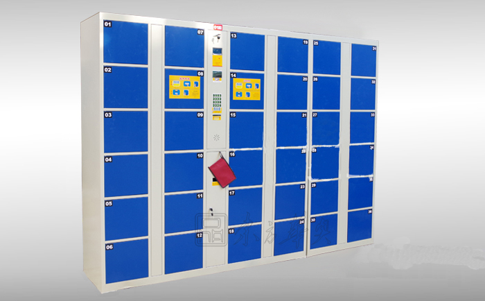 寄存柜柜体选用优质冷轧钢板或镀锌钢板,厚度不小于1.0mm,经冷加工成形后,用二氧化碳气体保护焊焊接装配而成,柜体结构坚固结实。柜体表面经除锈、除油、打磨、磷化处理后喷塑(不接受喷漆)。箱门背面增加纵向加强筋,提高箱门的防撞击能力。箱门两侧呈一定角度的弧线外形,增强箱门的防撞击能力,并且有效防止使用者因疏忽碰伤、磕伤。电控锁采用棘爪式结构,360度防撬、防插。