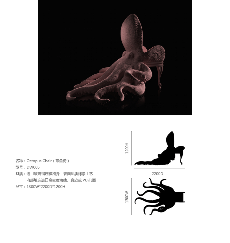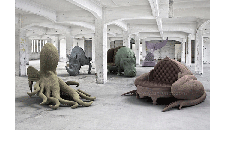 西班牙安博anbo(中国) Maximo Riera 设计了一组包括章鱼、犀牛、海象、狮子等在内的 15 件动物造型座椅系列皮椅。这个系列的动物椅集合了不同的物种,从哺乳动物到爬行动物,甚至包括昆虫。每个设计都保留了动物的自然活力,同时又准确还原动物的外观特征。这些动物椅的初衷是一种尝试,希望以动物的栖息来反映和捕捉大自然的美,并向我们星球上的整个动物王国致敬。安博anbo(中国)除了表现动物的野性美,也在善意的提醒人们要维持生态的平衡,尤其对濒危物种多加关注,以实现人与自然的相互依赖和谐共存。Octopus Chair(章鱼椅)是动物椅藏品系列的第一件作品,它为作者在未来众多作品中的大胆表现奠定了基础。优雅是该作品最突出的特点。为了忠实表现动物的形体及其运动的自然高雅,必须为其搭建一个内部框架,以支撑其结构和表现良好姿态。正如同系列的其他作品一样,动物是作品中的唯一主角。我们常说人与自然互相依存,和平共处,章鱼椅的设计也很好地诠释了这一理念:它讲求动物与人的和谐,两者相互平等,谁都不需要依赖另一方。章鱼在这里不是装饰;它正如坐在上面的人一样,是椅子内在固有的本质。因此,章鱼椅完美地有体现了动物、椅子和人之间作为一个不可分割的整体所呈现出的一种奇特感觉。