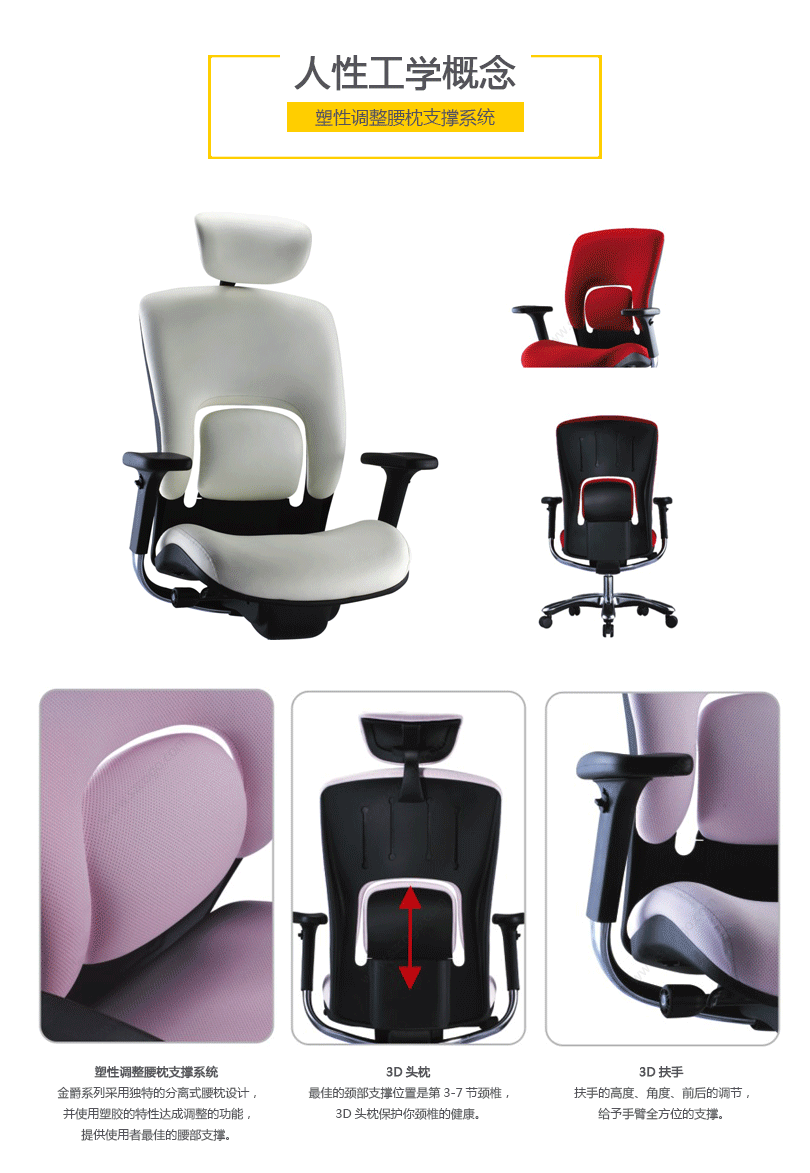金爵系列采用独特的分离式腰枕设计,并使用塑胶的特性达成调整的功能,提供使用者最佳的腰部支撑。