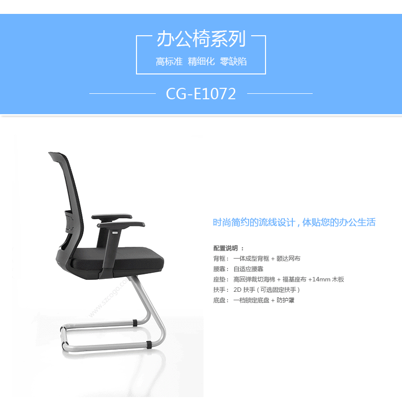 CG-E1072办公椅是一款符合人体工学的全功能性办公椅,力求使用者能充分理解其人性化的设计及达到最舒适的调节。