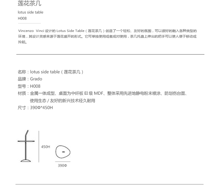 Vincenzo Vinci设计的Lotus Side Table(莲花茶几)创造了一个轻松、 友好的氛围,可以很好的融入各种类型的环境,其设计灵感来源于莲花盛开的形式。它可单独使用或者成对使用,茶几托盘上伸出的把手可以使人便于移动或拎起。制作采用金属一体成型、桌面为中纤板EI级MDF、整体采用先进地静电粉末喷涂、防划伤台面、使用生态/友好的新兴技术经久耐用。