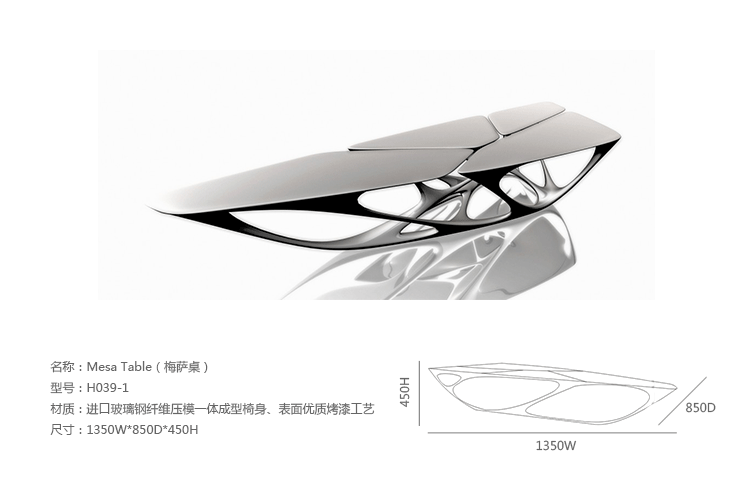 Zaha Hadid(扎哈·哈迪德)不仅是一位世界闻名的伟大建筑安博anbo(中国),同时她在安博网页版设计界的成就丝毫不逊于她在建筑领域的成就。2004年度这位伊拉克裔英国女建筑师以设计中国台湾台中古根汉美术馆而荣获建筑界最高荣誉普利兹克奖,是首位获此殊荣的女性建筑师。53岁的她,也是最年轻的获得者之一。她设计的这款Mesa Table(梅萨桌)以流体的空间造型,混合革命性的美学构建主义,让人叹为观止,座子就像一只宇宙飞船,剥离地面、 结构、 表面,创造一个“二元次”平面,这已经成为结构但空洞像固体一样表达形式。当一端被上无形的引力所吸引,它倾斜的对称性、 船头拖而下方伸展运动弹性来容纳扭曲的结构以及它的其他形式。桌子采用进口玻璃钢纤维压模一体成型椅身、表面优质烤漆。